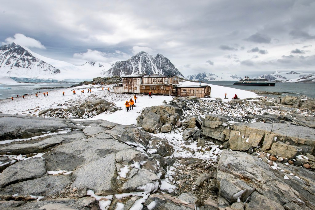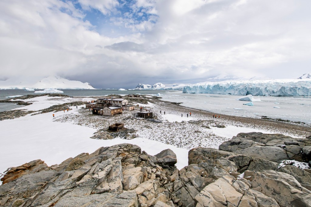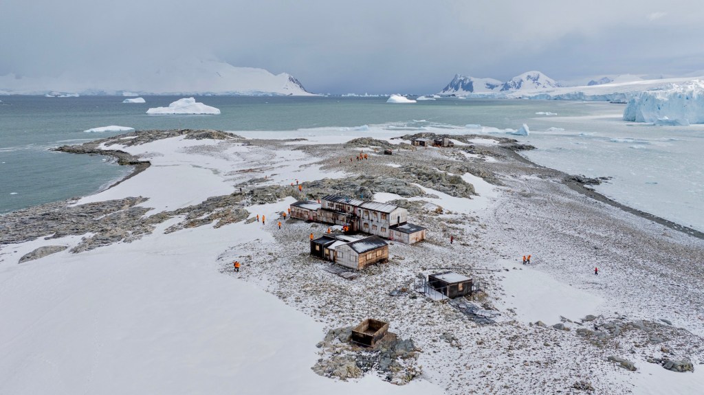 There are two historic stations at Stonington Island, a US station in the foreground and a UK station in the background.
