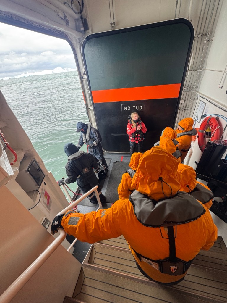 The protocol for going to shore was to be all put together when your color group was called and proceed to the staging area. Then when directed, we would go to the mudroom to get our boots on and then line up to board the zodiacs.