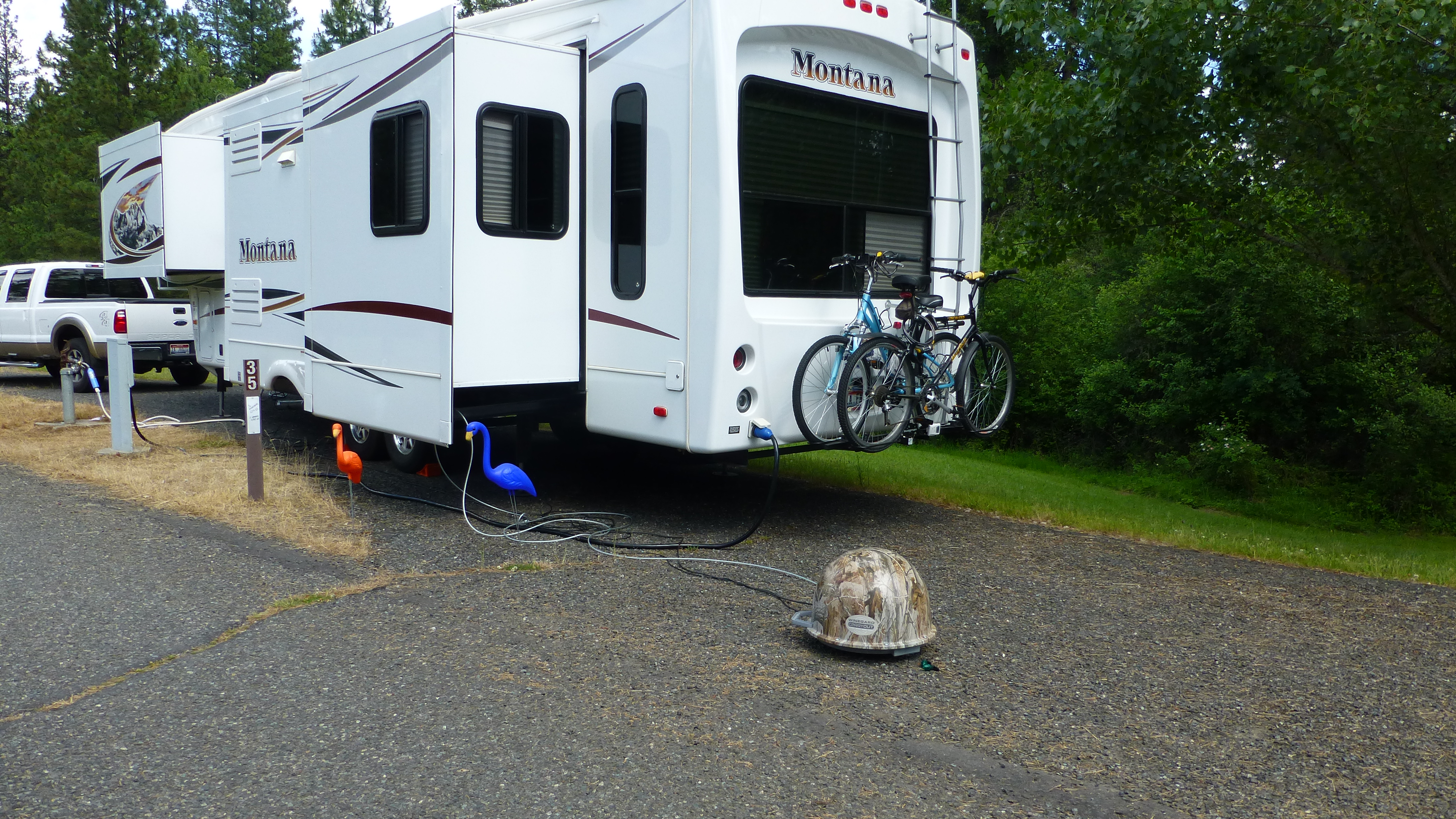 We spent the last four days/nights at Dworshack State Park, somewhere we had never been before. We were again in a cyber hole with only the state park Wi-Fi to keep us semi-connected. We had satellite service by just barely having room for our “dish” in our driveway, and just barely getting around the trees for a signal. We set out our Bronco flamingos (Thanks Sheri and Chip!) to call attention to the area so a driver didn’t accidently clip it.