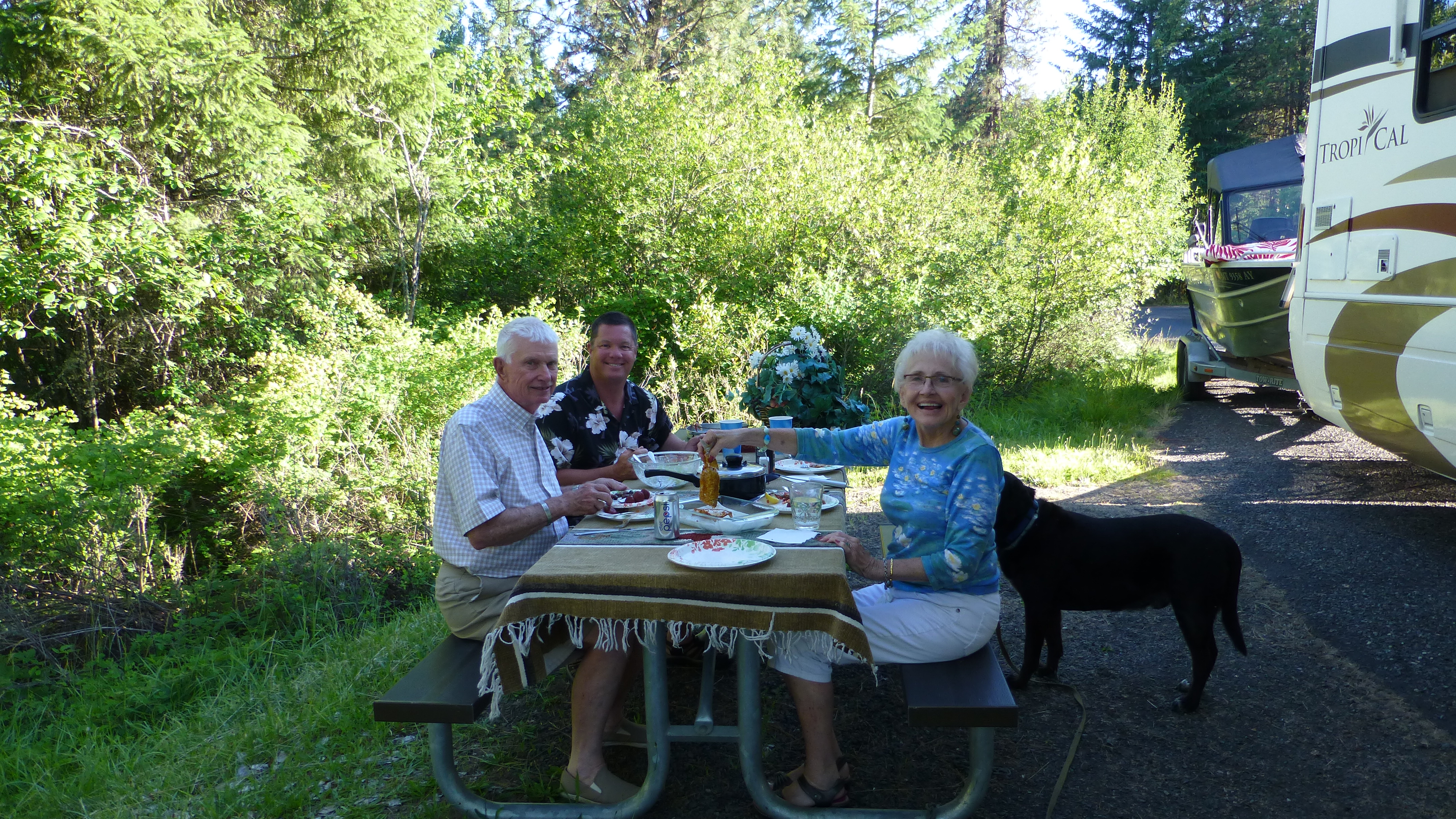 The satellite dish and the flamingos were conversation starters with a variety of people in the park. Fortunately for us, they started a conversation with our neighbors Dee and Fred. They are from San Jose and were at Dworshack on a fishing trip. Dee was really interested in World Cup Soccer, so we invited them over to watch the US-Portugal game and they invited us to dinner. It was a nice afternoon and evening. We hope to have many of those type of experiences with people we meet on the road.