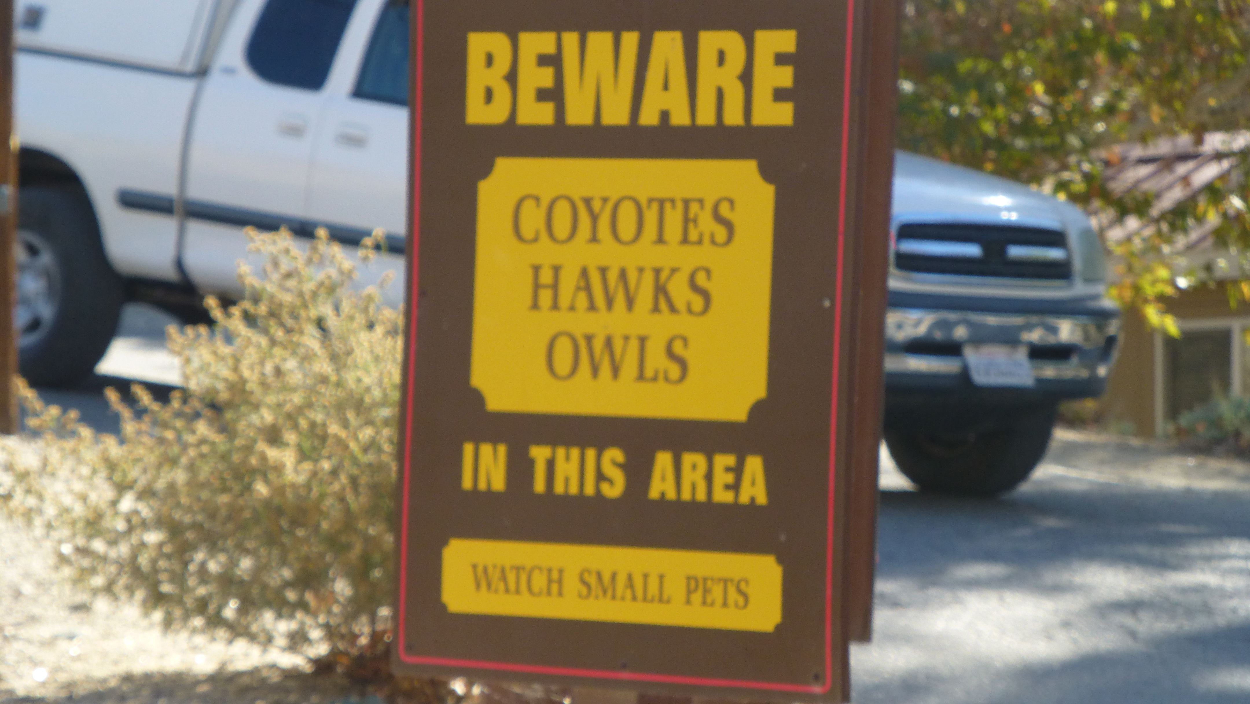 Our first “detour stop” was Soledad Canyon RV Resort near Acton, California. We arrived without drama and found a nice place on a ridge looking out at the San Gabriel Mountains. We did see this sign as we entered our camping loop warning people to watch their small pets. We were glad Elko is big.
