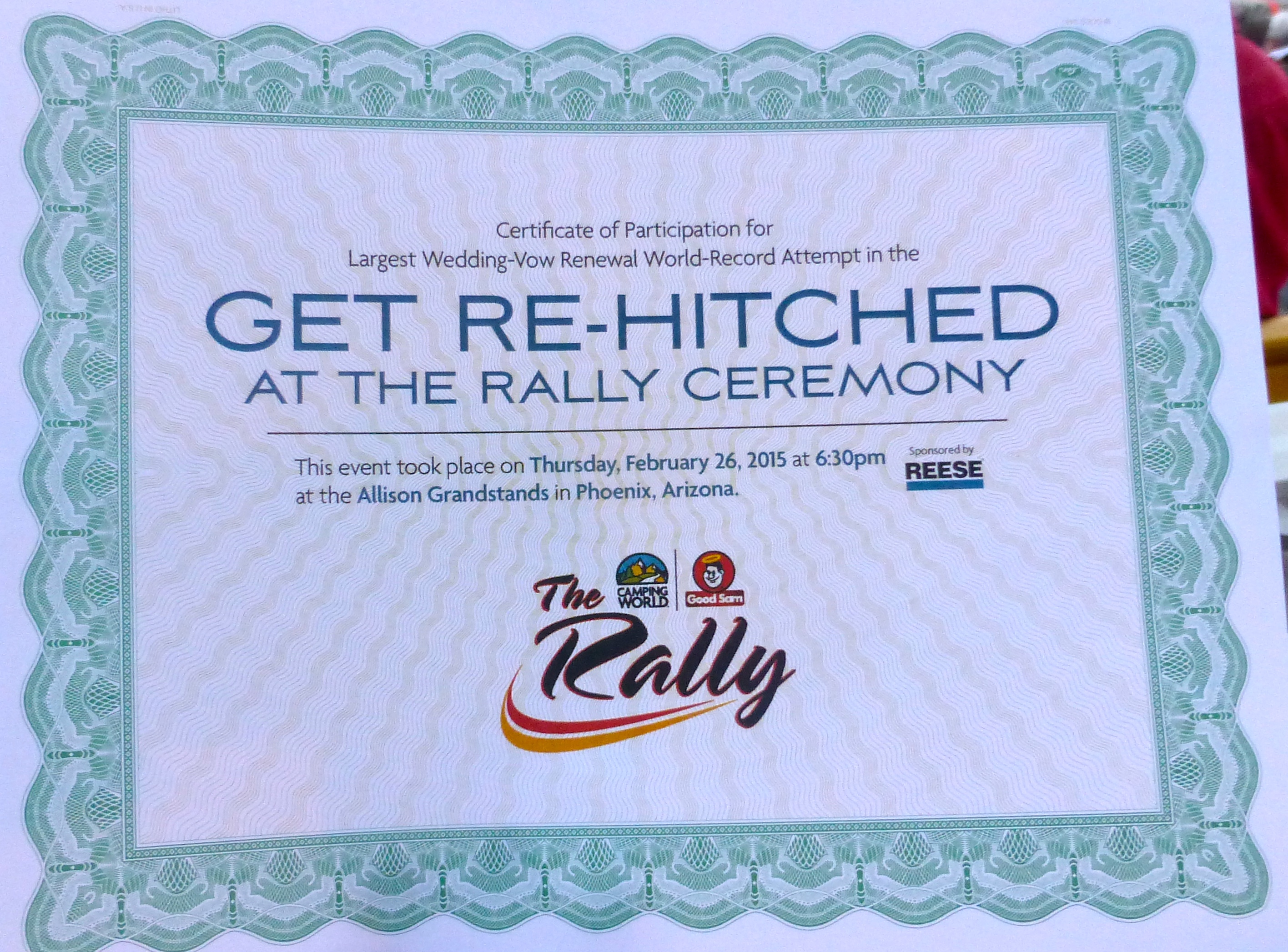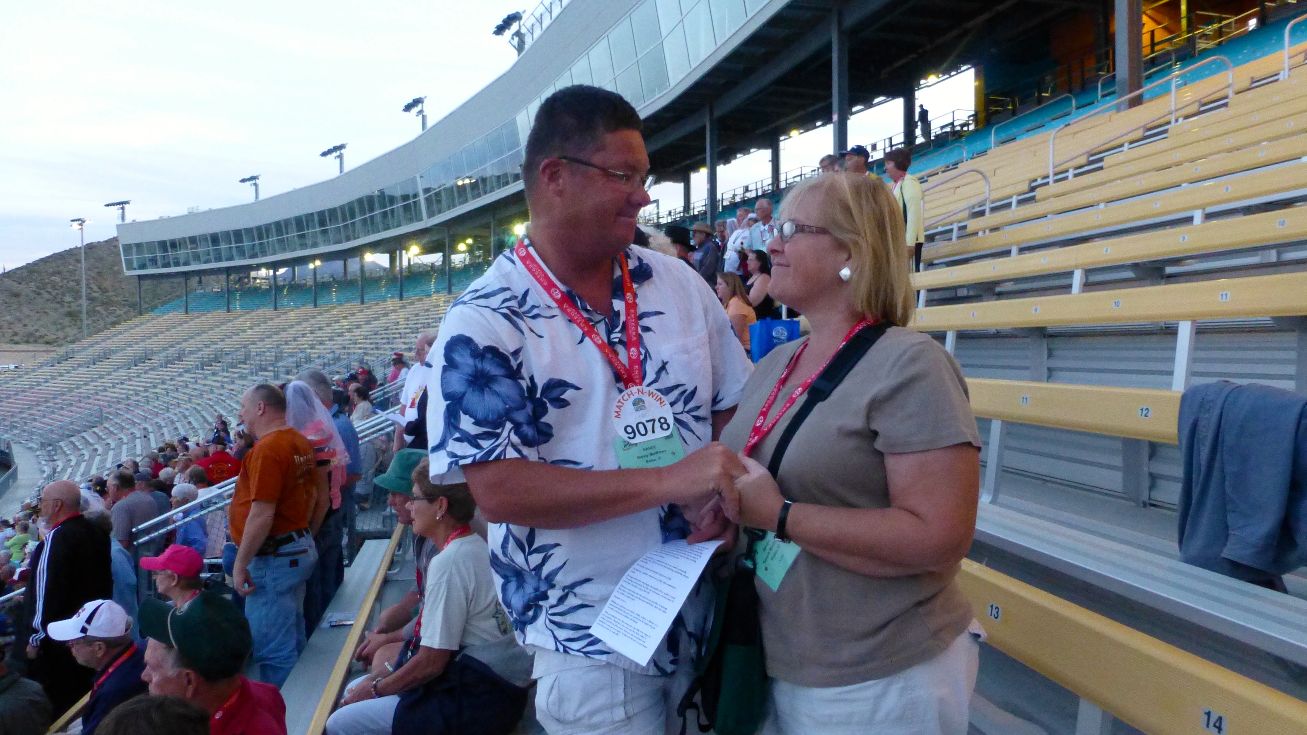 We are at the Good Sam Rally (sponsored by Camping World) being held at Phoenix International Raceway. One of the activities was to try and break the world record (currently 1087 couples) for people getting “re-hitched.” The counting and cross checking marriage license copies has not yet been completed so we don’t know, yet, if we are world record holders.