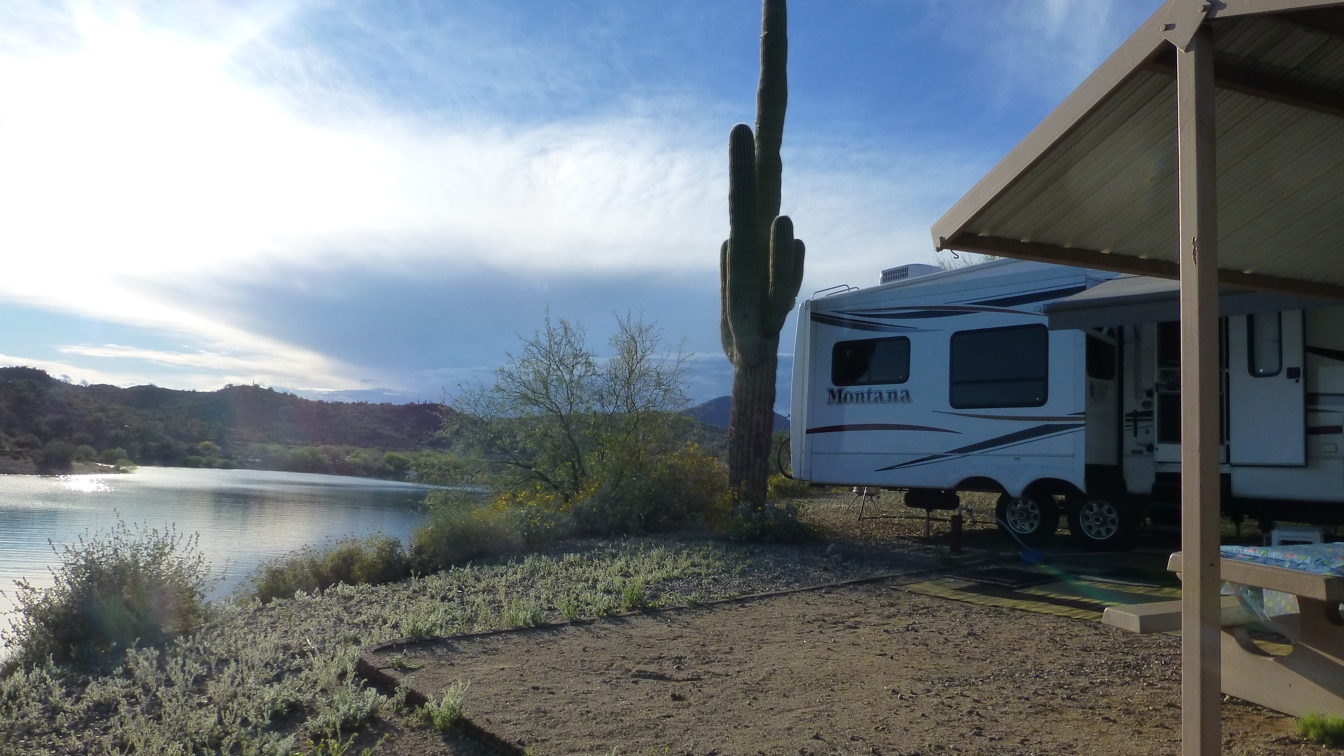 Lake Pleasant Regional Park is about 20 miles north of Phoenix and has a nice desert landscape with the bonus of a dam inspired lake. Our campsite was right on the lake and Elko enjoyed getting his legs and tummy wet several times each day.