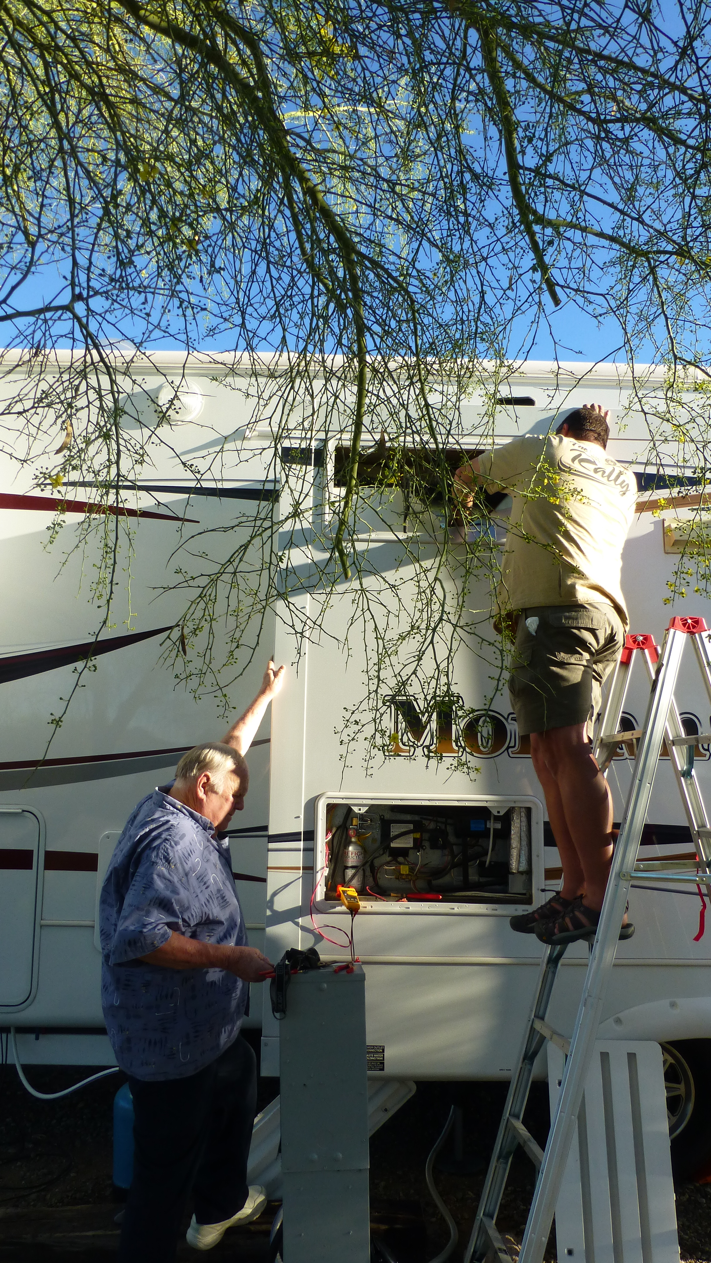 Also the clientele was a little rougher than the snowbirds we have become use to. Those playing loud music into the night and gun shooting campers aren’t our preferred mates. We did, however, meet a few nice people, including neighbors on one side who had come to AZ for Texas Rangers Spring Training and the neighbors on the other side spending their very first night in their new motorhome. They needed some help and Randy was glad to comply.