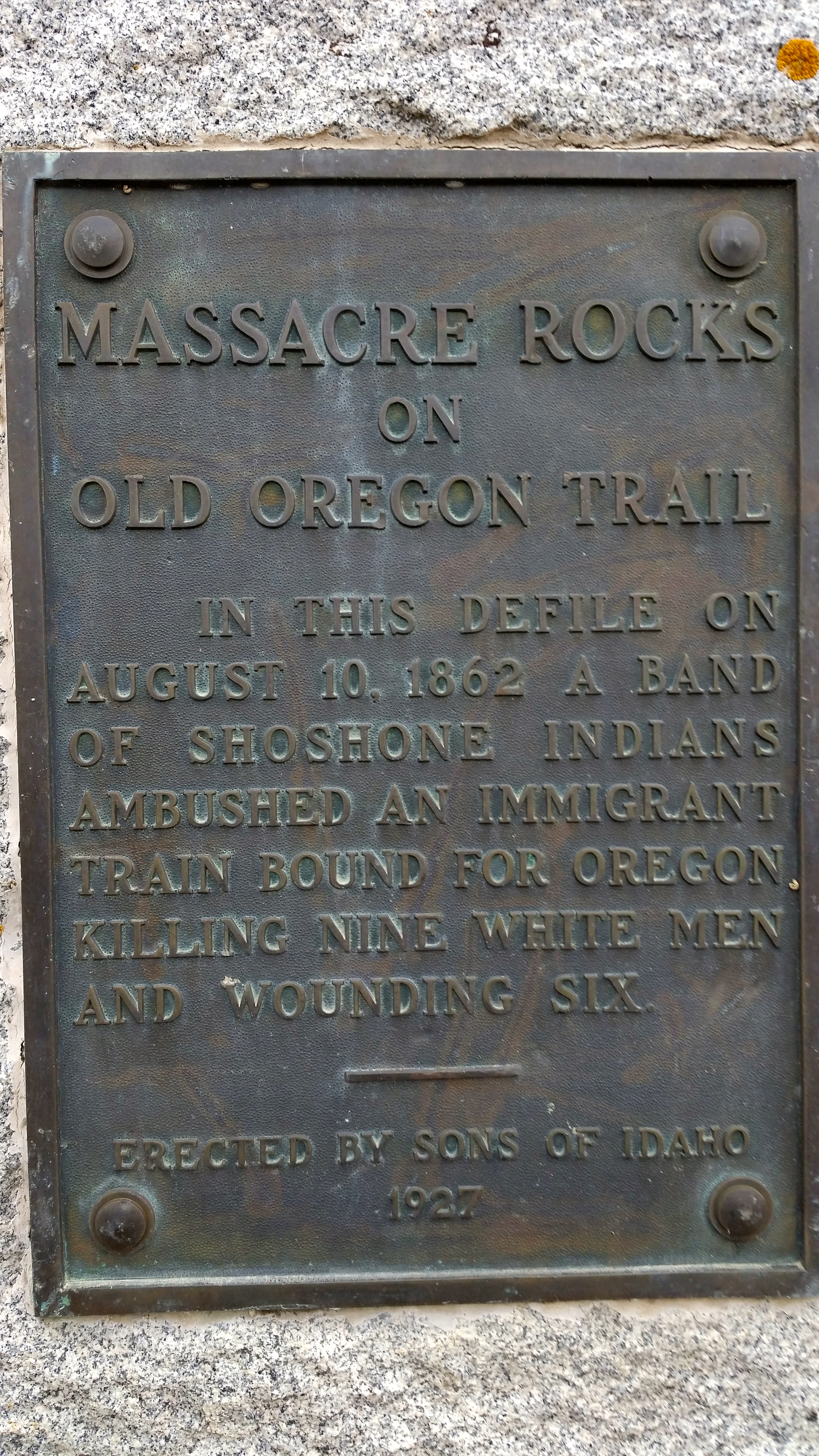 Interestingly enough, we finally got an explanation about Massacre Rocks – which is missing from the park information on the Idaho Parks website and other places I looked. Maybe political correctness is at work. So, since I had given false information in the previous blog, we thought a correction was appropriate. The large rock on the left is Memorial Rock to commemorate those killed in this area on 3 separate occurrences between the Oregon Trail emigrants and the Shoshone Indians from 1851 to 1862.