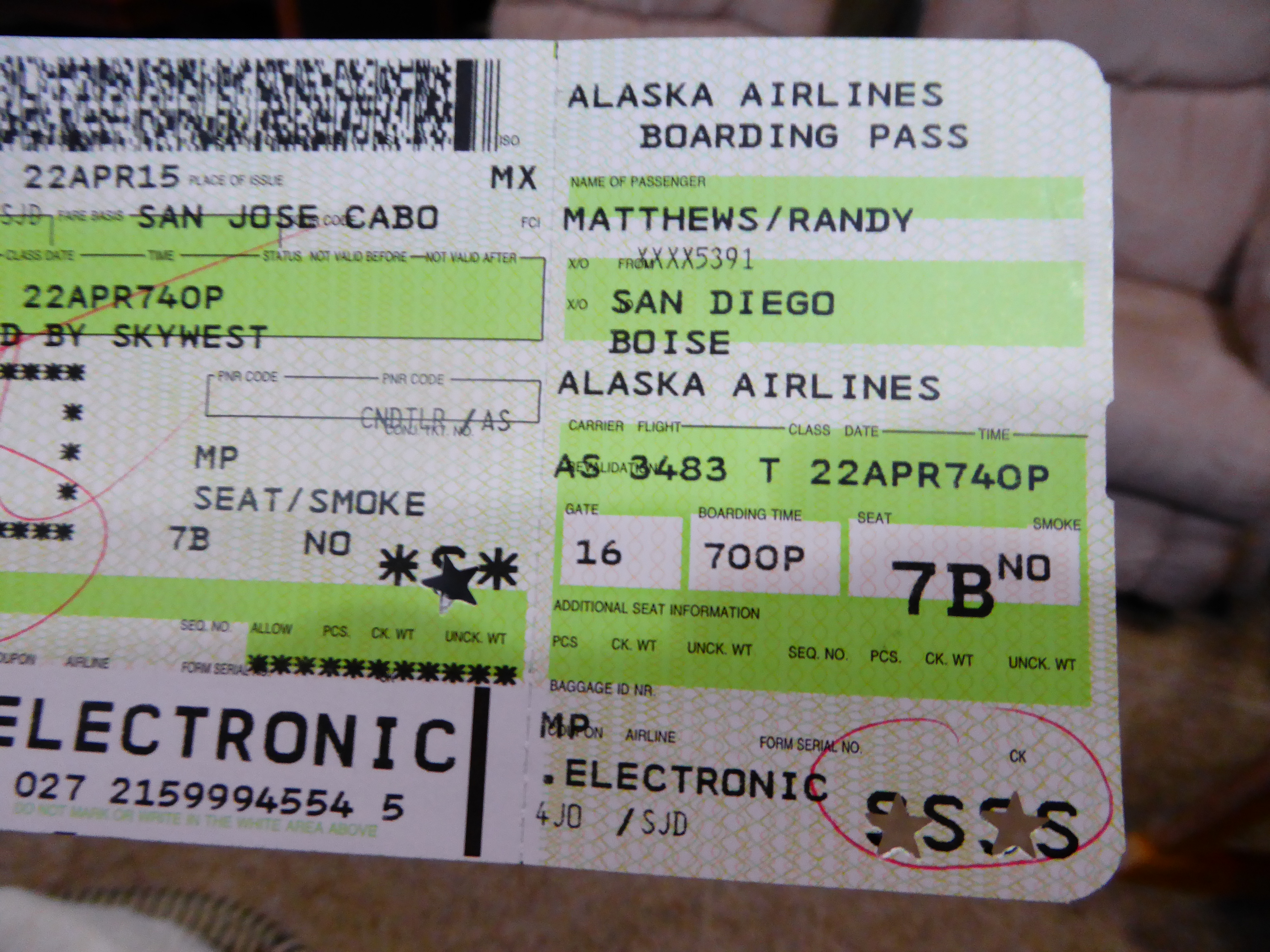 We had easy flights down to Cabo, even getting benefit of TSA Precheck where screening is minimal and easy! Coming back was a different story! Randy got the dreaded SSSS on his boarding pass (who knows why?!) and was searched thoroughly out of Cabo even including swabbing his hands, shoes and backpack.