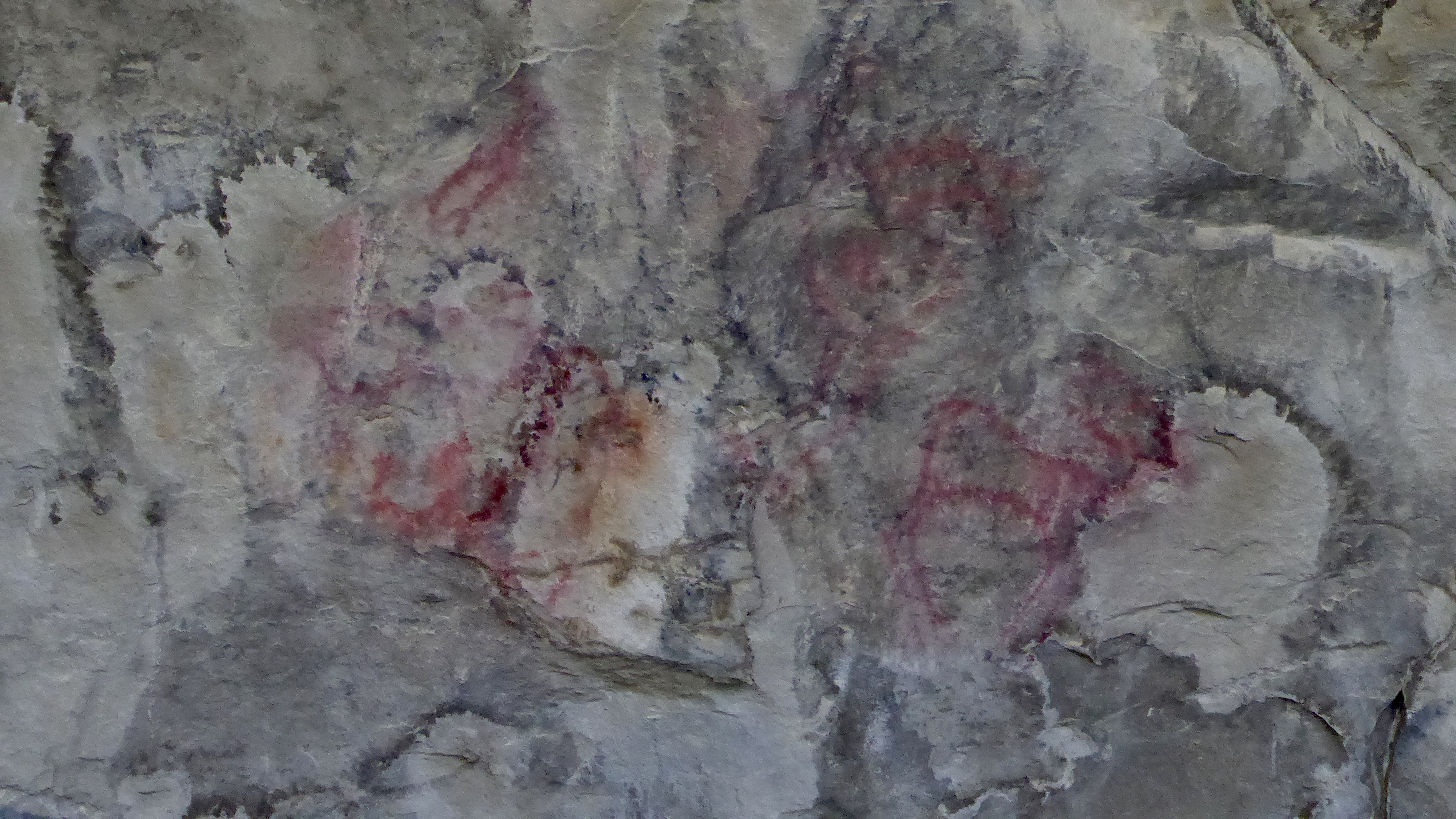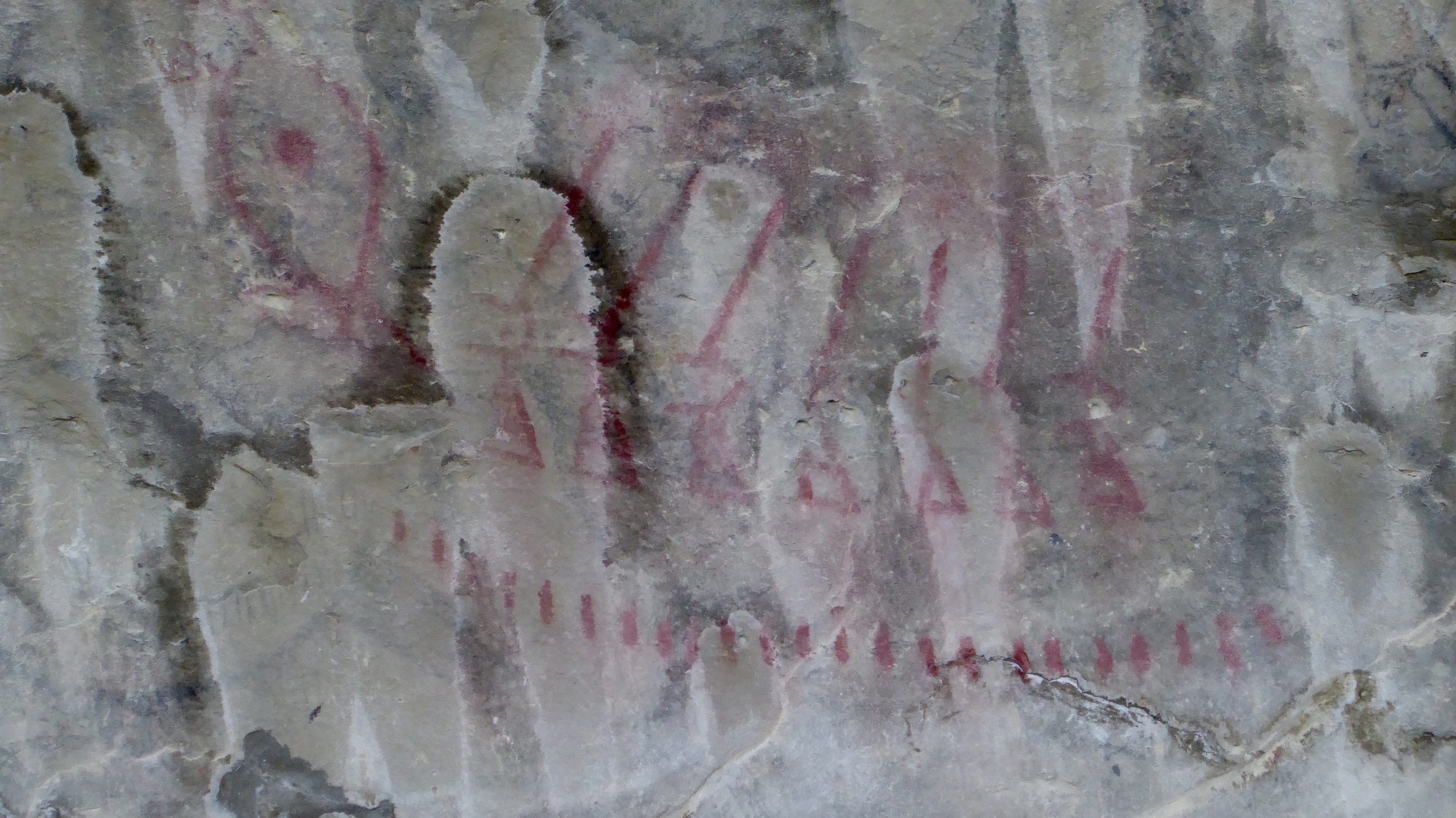 Black, charcoal pictographs, which were not visible, date back to approximately 250 BC. Many of the pictographs have been lost over time to environmental issues and shifting/cracking of the cave walls. Better get here quick if you want to see them!