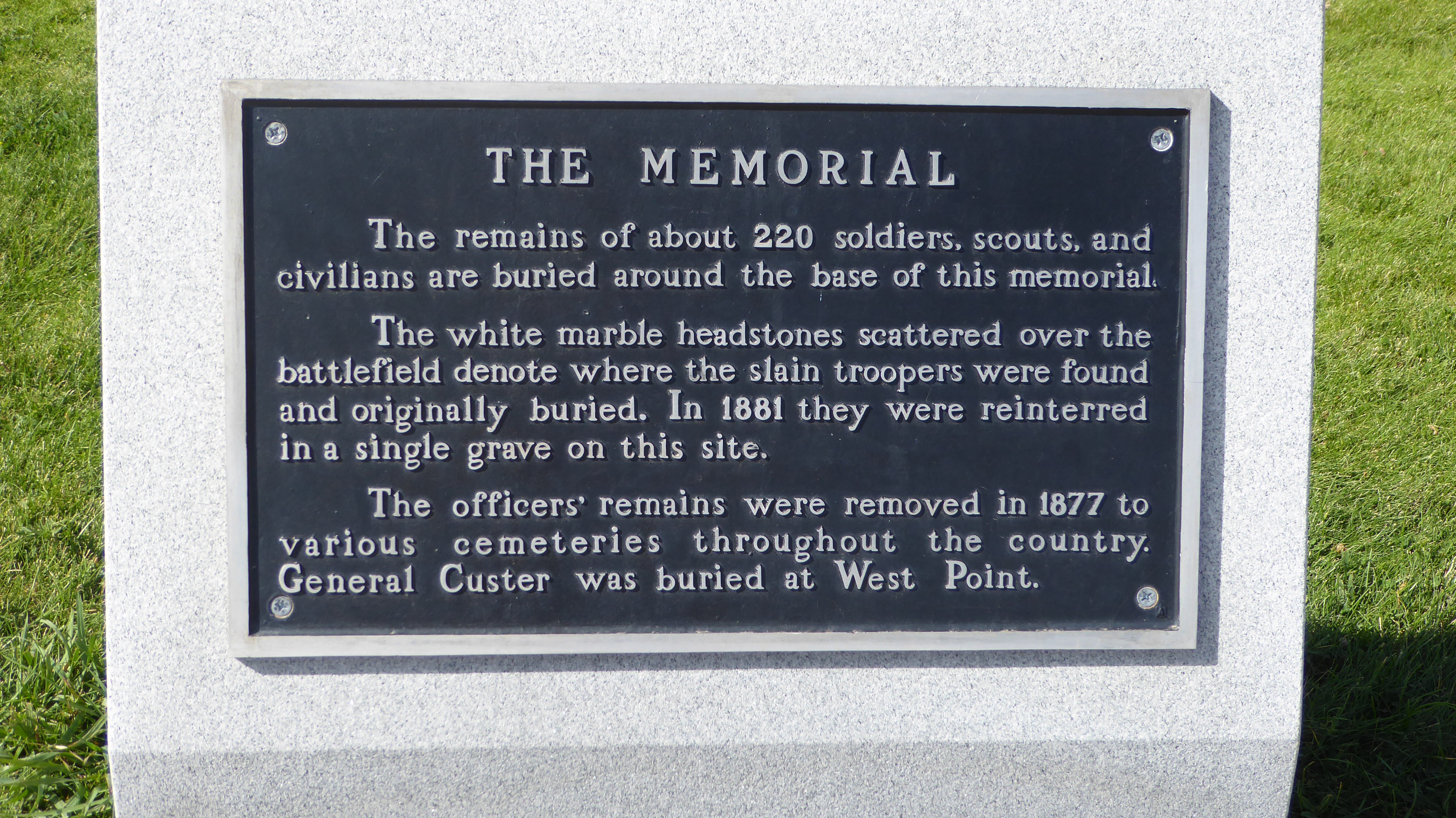 In 1881, remains of soldiers were collected and placed in a mass grave at Last Stand Hill around the base of the Memorial shaft bearing the names of soldiers, scouts and civilians.
