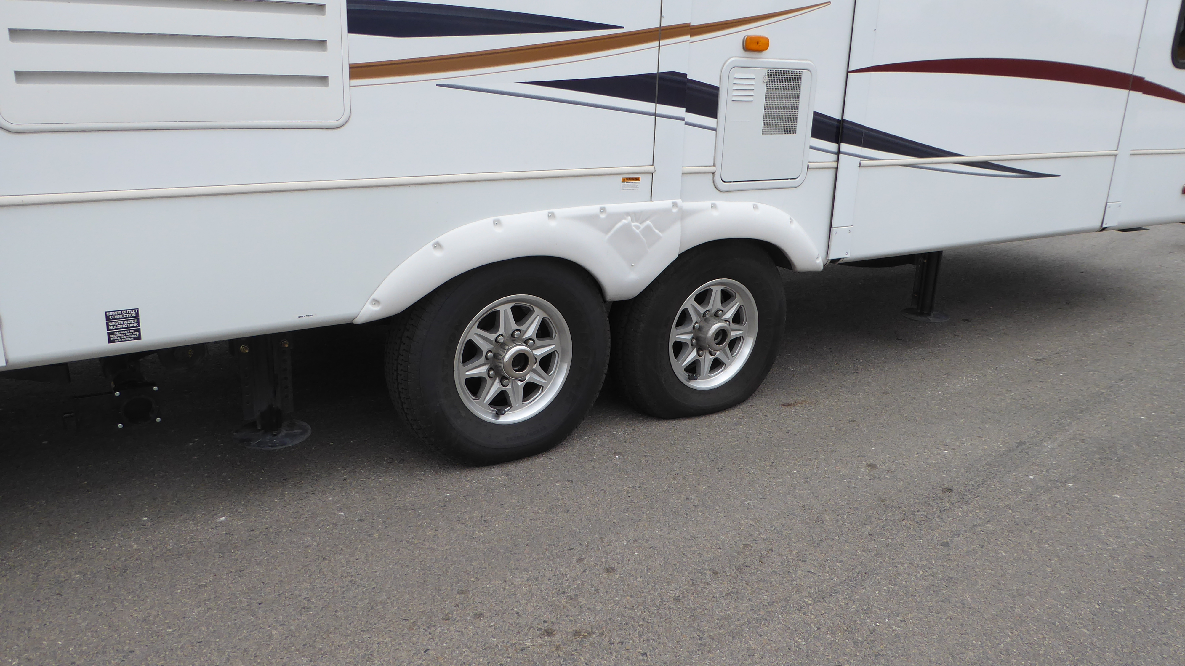 We are now the proud owners of two new Maxxis tires. Our Goodyear tires on the back were only 16 months old (and four of those were sitting still) yet the steel bands were separating.  We had multiple leaks in one tire and bulging in the other. There is still a second set of Goodyears on the trailer that are about 9 months old. We’ll see…..You can’t mess with tires in this lifestyle.