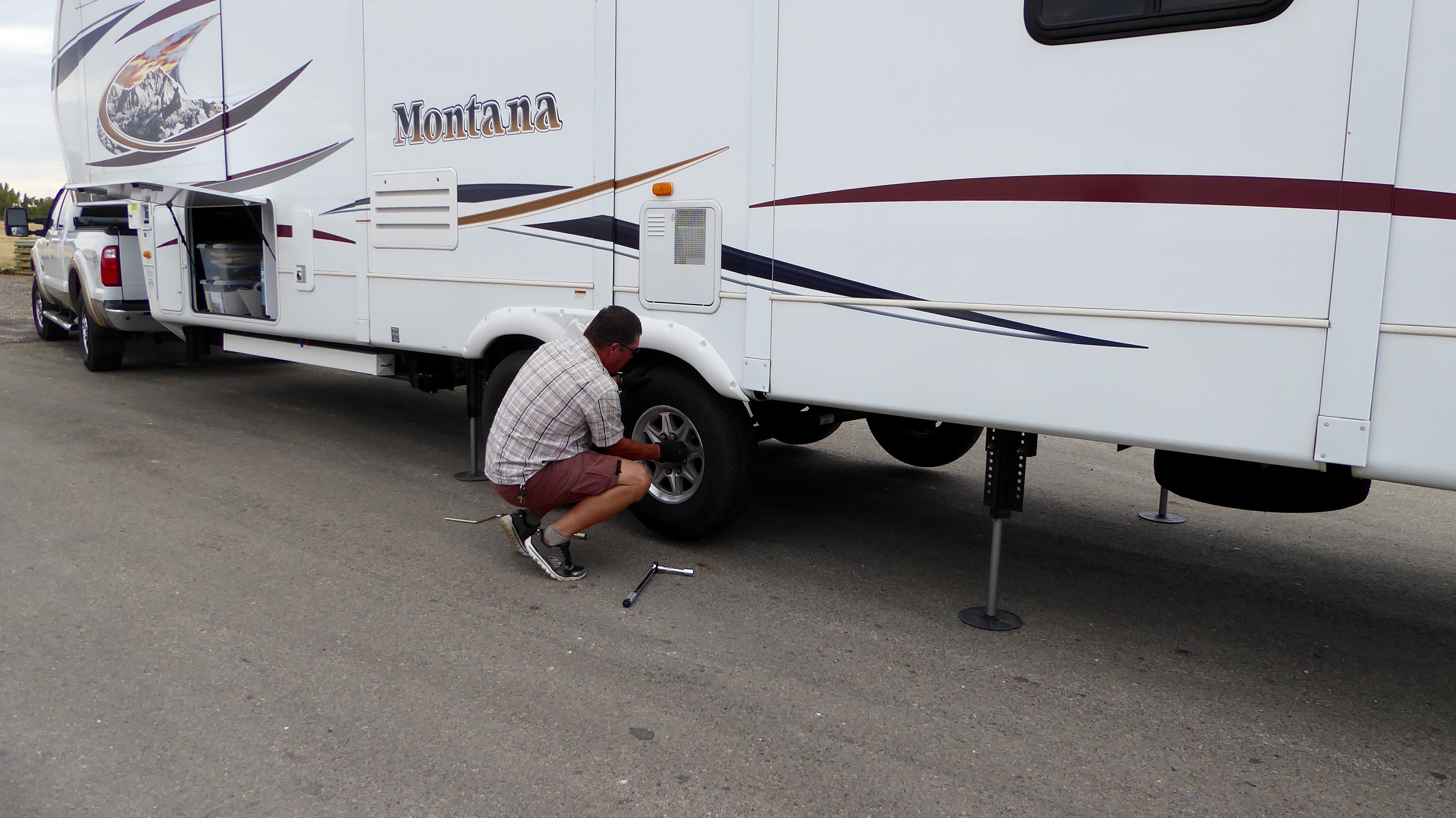 Randy decided he needed to change to the spare tire. Fortunately our auto-leveling jacks make that job easier than it would have been with a typical jack.