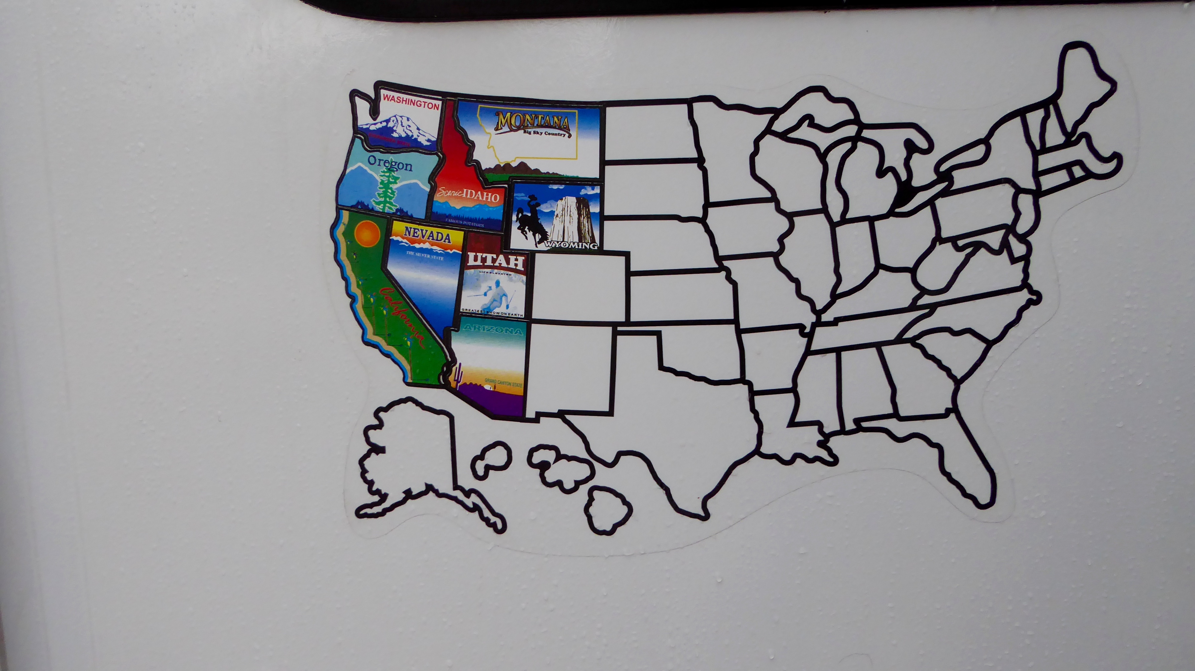 When we woke, having spent the night in Wyoming, we added a sticker to our map!   It is looking a little better.  (Next week – Colorado.)