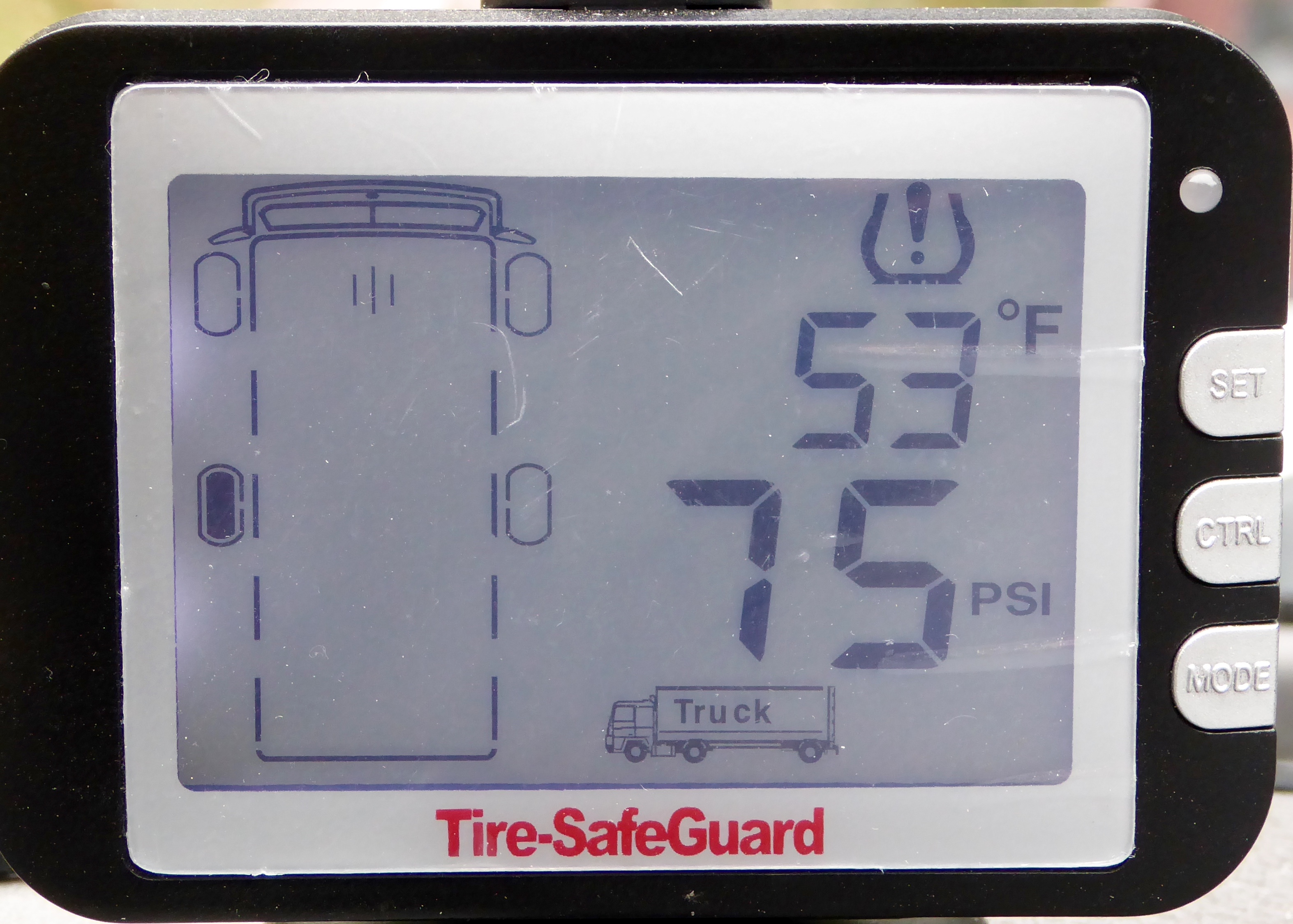 The TPMS measures and continuously updates the temperature and air pressure on all eight truck and trailer tires. We had an issue  with the driver’s side back trailer tire. The tire pressure usually measures 80 – 95 psi. The alarm sounded when the pressure reduced to 75 psi.  In the few minutes it took to get off the freeway and find a place to stop, the pressure was down to 21 psi on that tire. It was flat!