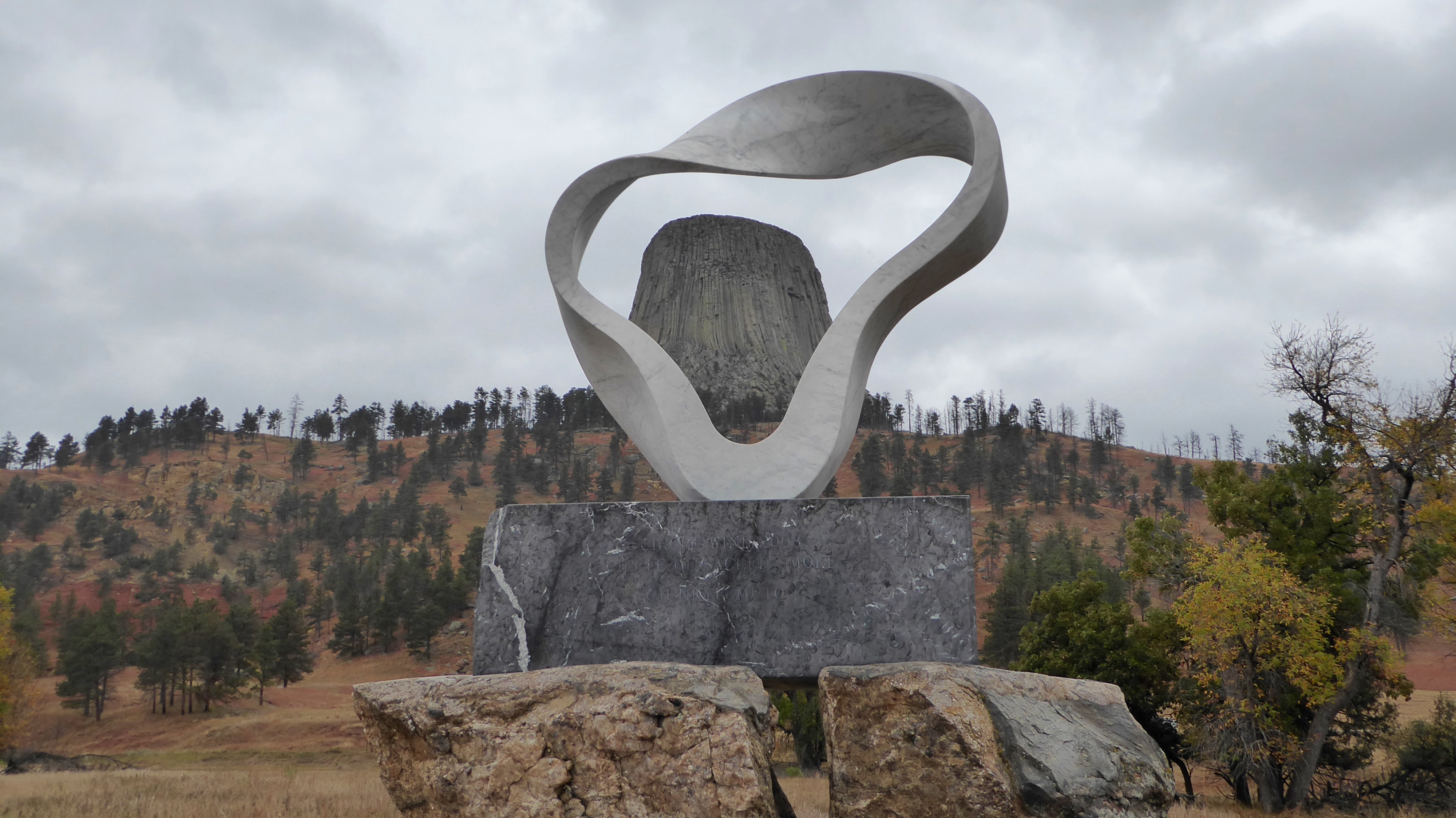Given its sacred past, Devils Tower was chosen as an International Peace Project Site by Japanese Artist Junkyu Moto in 2008. (The other two sites are Vatican City, Rome and Bodh Gaya, India, where the Buddha reached enlightenment.) His sculpture here is called the Circle of Sacred Smoke.