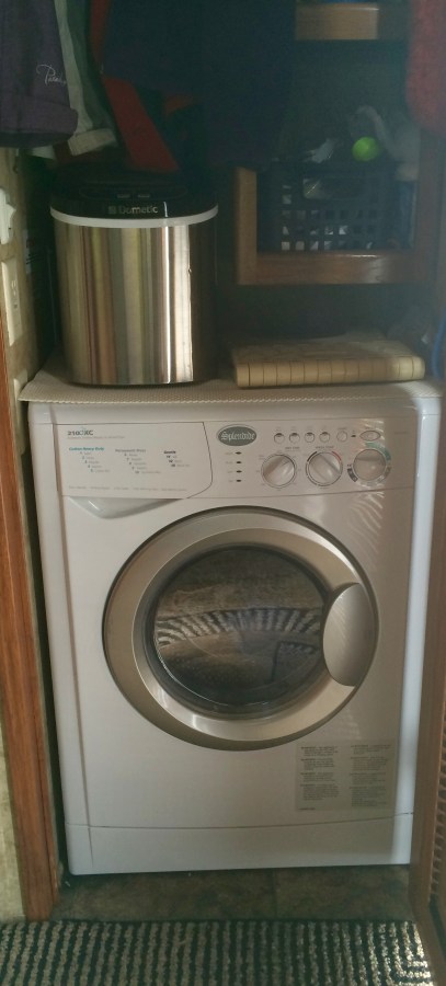 Portable ice maker is sitting on the washer-dryer combo. Both are in the important front closet.