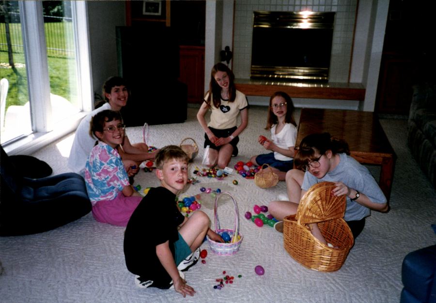 The Berg, Sloan and Matthews kids, at our house one Easter in the 90’s. Our lawyer, Shannon, is in the pink skirt on the left!