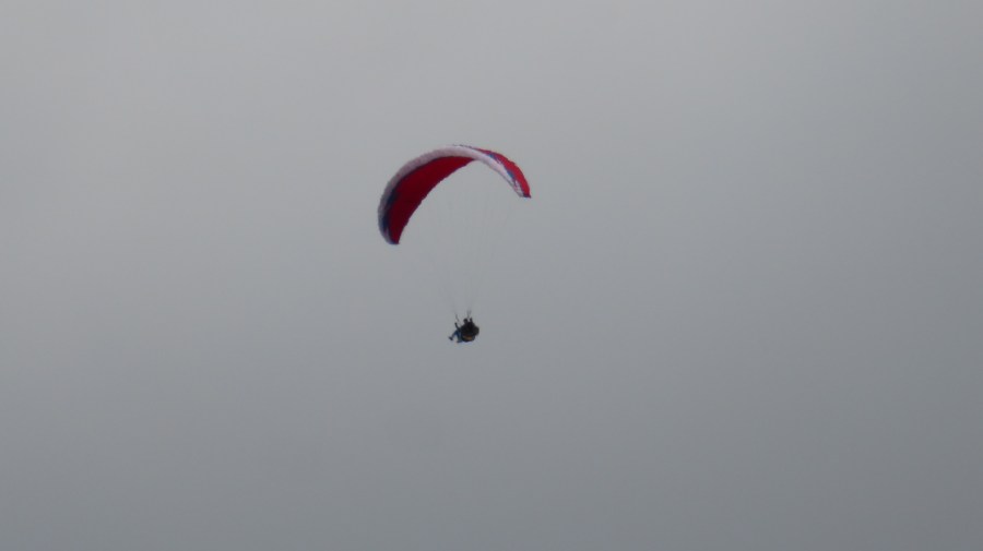 We rode up in the tram with this paraglider. After hiking up even further, he usually gets about one hour of flight time.