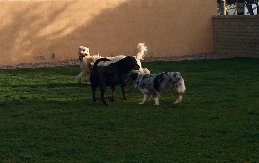 Elko has had a great time playing in the dog parks. Most even have grass – a rare commodity down here.