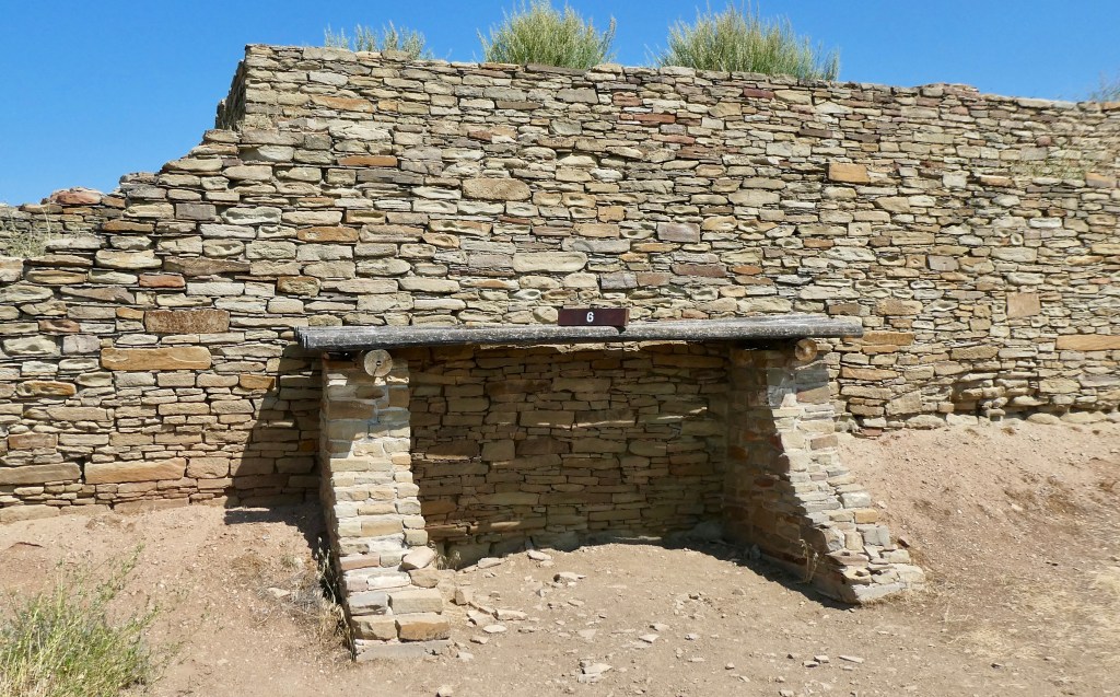 Architecture and pottery similarities establish that Chaco relationship for archeologists. The wall under the shelter above is the only section of original wall available for viewing. Other areas have been rebuilt (using original stones as possible) and stabilized with concrete. When in use, the walls and roofs would have had a covering of adobe.
