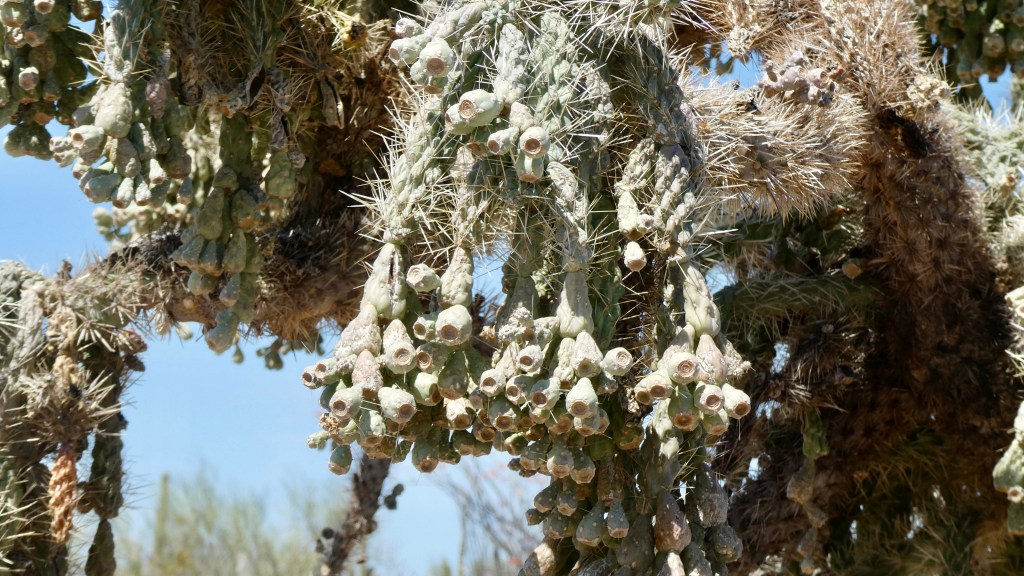 This is a chain-fruit cholla cactus. The fruit pieces are edible and some animals rely on them during drought for food and water.