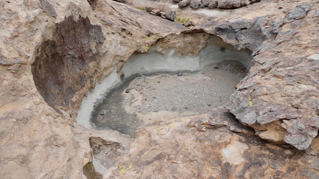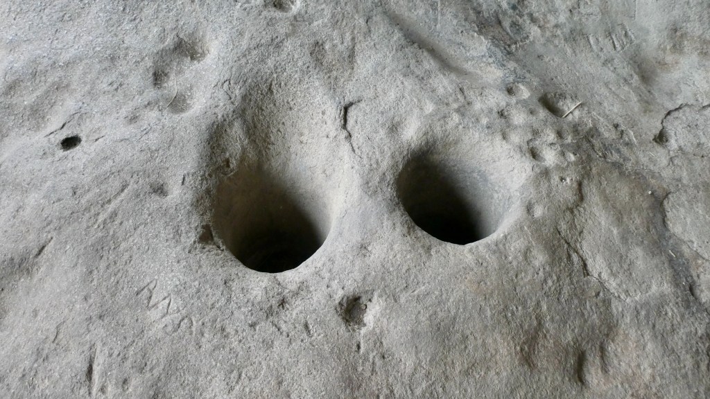 Rock cavities formed as women ground roots and seeds. They are seen in many places around Hueco Tanks.