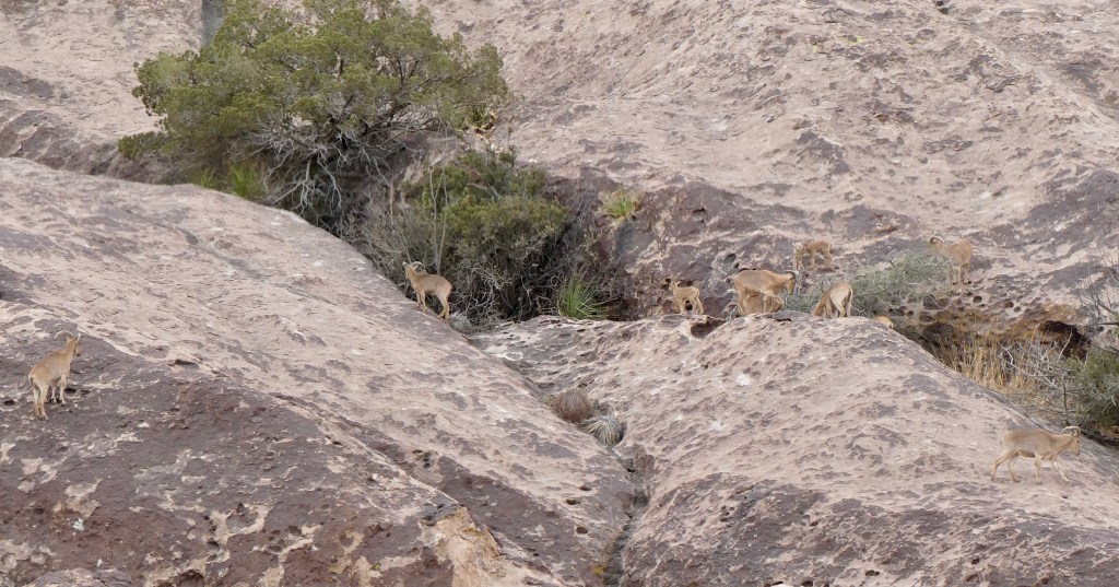 They haveΒ no predator except for the rare large cat and no hunting is allowed in the park. Β  We saw the aoudad every day we hiked and one time saw a herd of about 25 climbing through the rocks eating the vegetation. Β  It will be interesting to know what happens with the aoudad going forward.Β  As the herd continues to grow, the status quo seems untenable.
