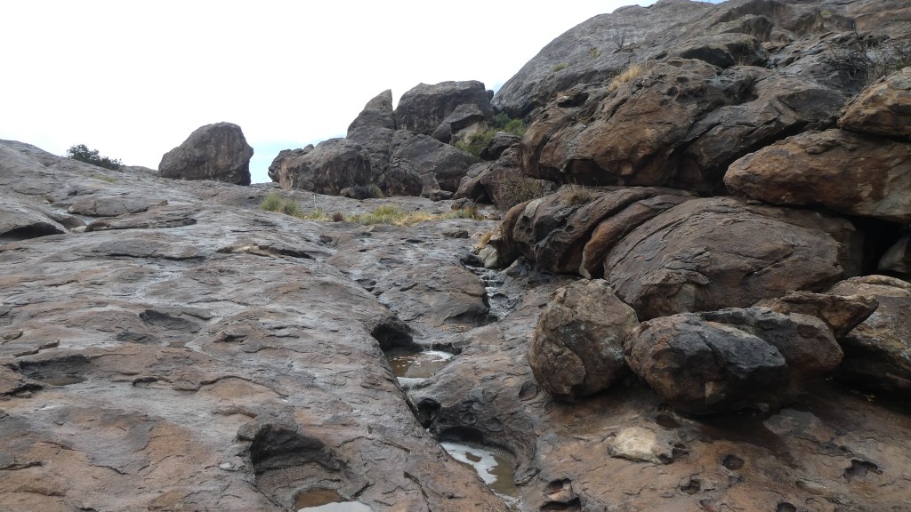 Rainwater collects in these natural tanks that are all over the boulder mountains.