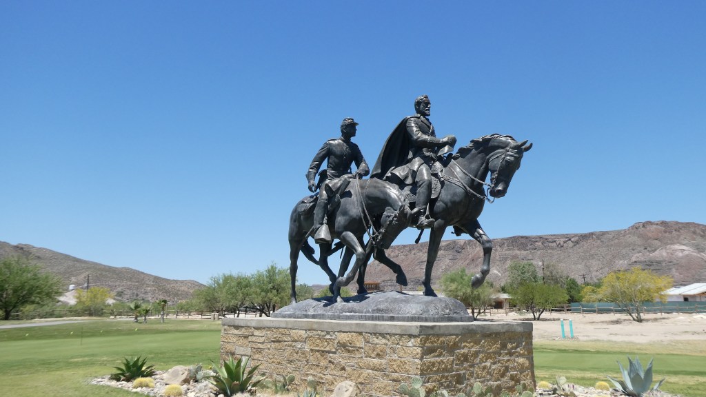 The adornment on the putting green is the statue “Robert E Lee and the Confederate Soldier.”  Did you ever wonder where those statues that are deemed inappropriate and removed go to die? Or where they go to live on?  One of them came to Lajitas.  This statue was removed by the Dallas City Council in 2017.  It resurfaced at an auction in 2019, was purchased by an anonymous buyer, and donated to Lajitas Golf Resort.