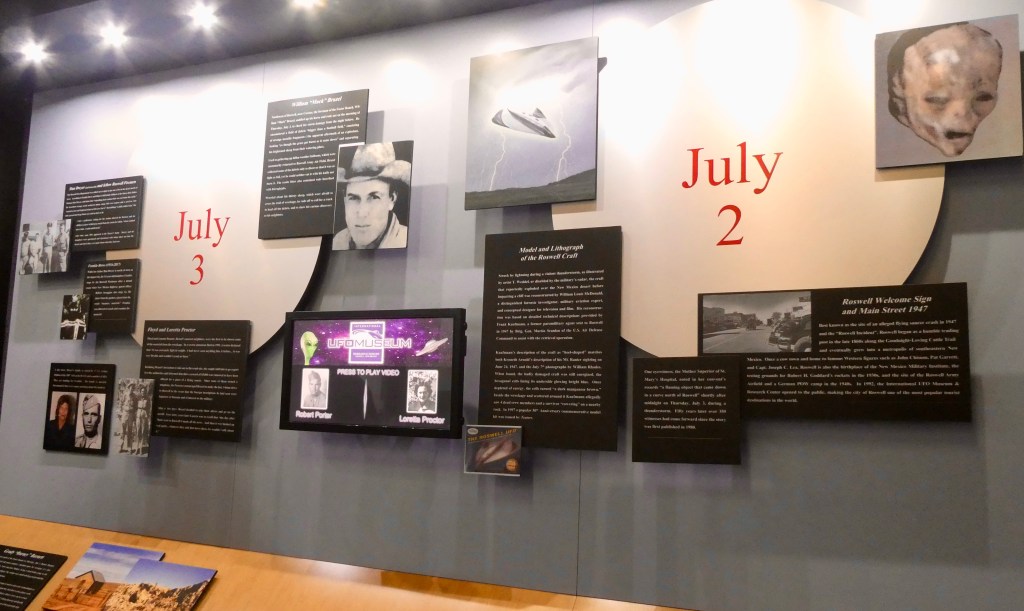The first exhibit was about the Roswell Incident: the 1947 crash of something that may or may not have been a flying disc.  There may or may not have been three aliens, one of which survived the crash.  Oh, and after first acknowledging the incident, the government later said it was a weather balloon. Surely you’ve heard of it!