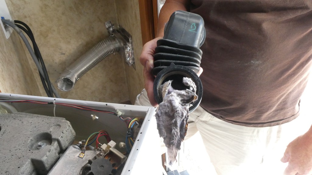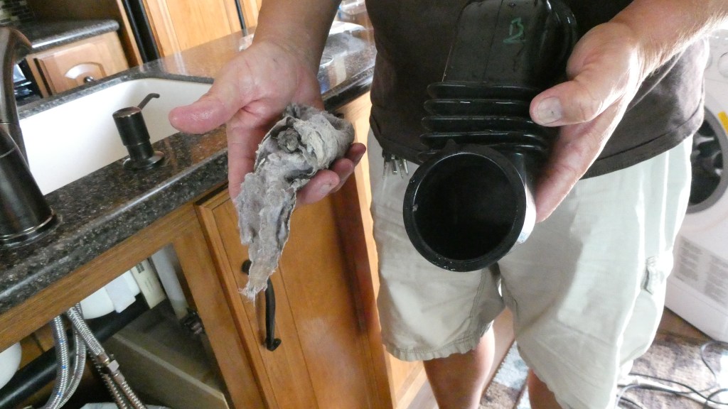 Sure enough, he found this disgusting mat of lint the size of a dead rat.  No wonder the machine was acting crazy.  We have no answer as to why this bizarre behavior wasn’t demonstrated when we last time used the trailer but was now. Perhaps being idle for awhile allowed that lint to settle and solidify.