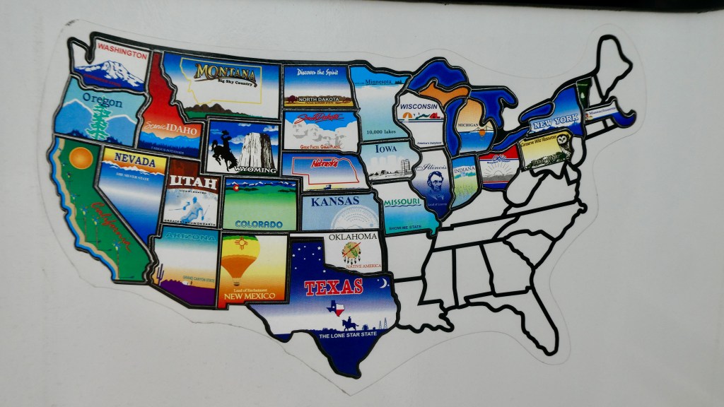 The plan is still to finish the map as we travel.  Our rule has been that we had to spend the night in a state to get the sticker and it is possible we will amend that going forward.   We hope to fly in, rent a car, and experience areas in much the same way we did in the trailer.   We enjoy historic hotels so we will likely add that to the mix.