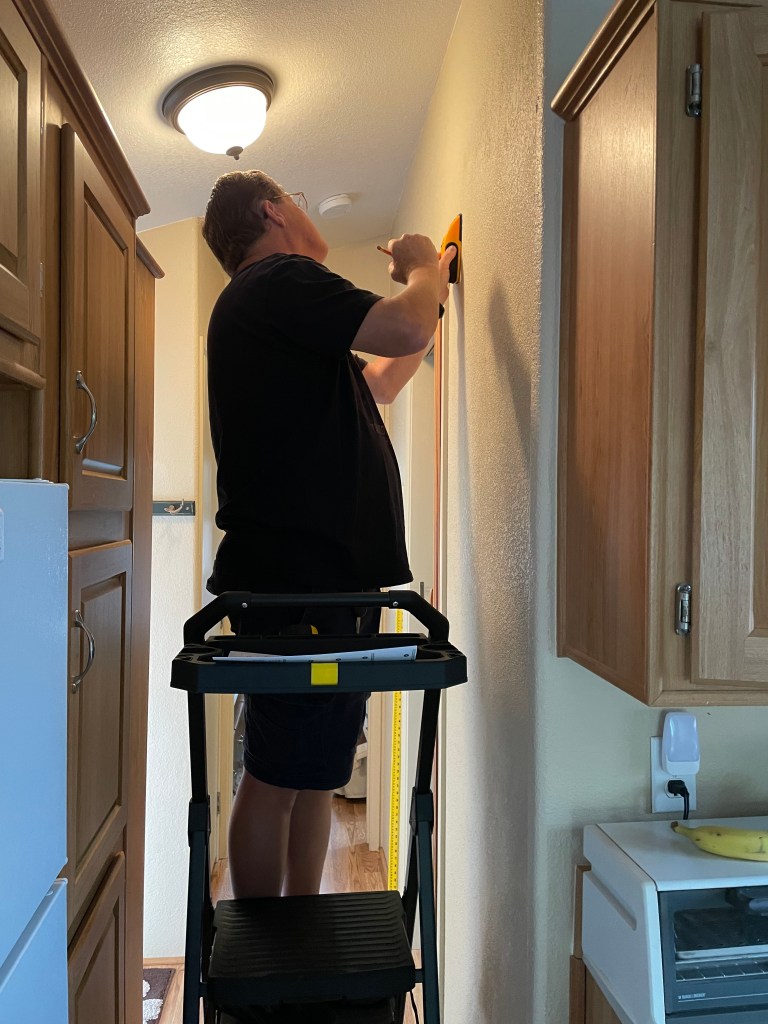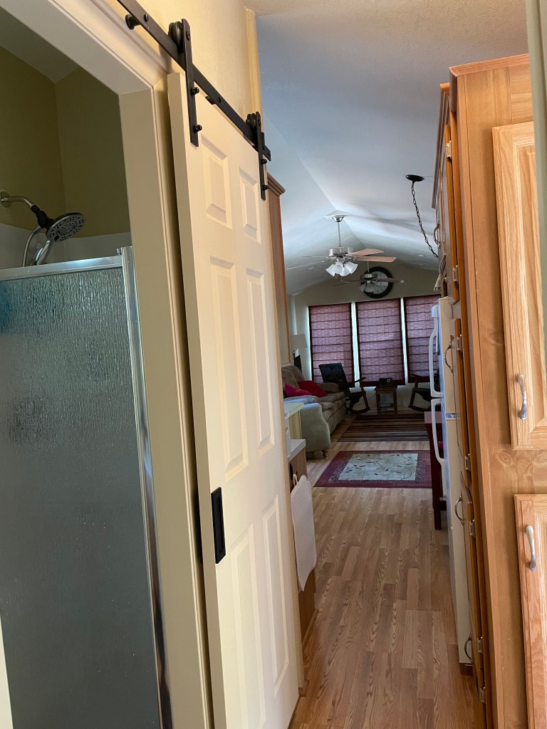 The focus of our second trip was to replace this vinyl accordion door going into the bathroom. Yeah, it is tacky. We didn’t have a lot of options and decided on a barn door. Great idea but tricky to implement in this miniature space. Barn door kits were too large and too heavy for our park model construction.