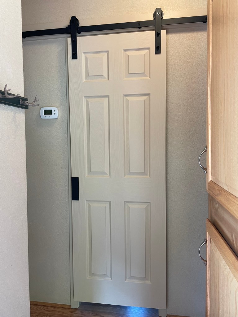 A saleswoman at Lowes suggested a 30″ interior door that cost $5 on clearance and separate barn door hardware.Randy had to use his engineering skills and his camera scope to get placement positioning and we measured and measured and re-measured.