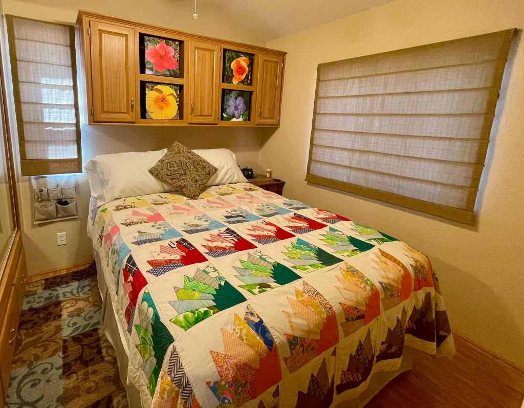 In the end we decided to keep the cupboards and hide the shelf storage with canvas prints of colorful flowers we had photographed over the years. It is nice to use the quilt my Grandma Dee made us as a wedding gift all those years ago. We have had a dog on the bed for most of our marriage so rarely had the quilt on top. One side of the room is mirrored closet doors and usually the shades are open so the room doesn’t feel small at all.