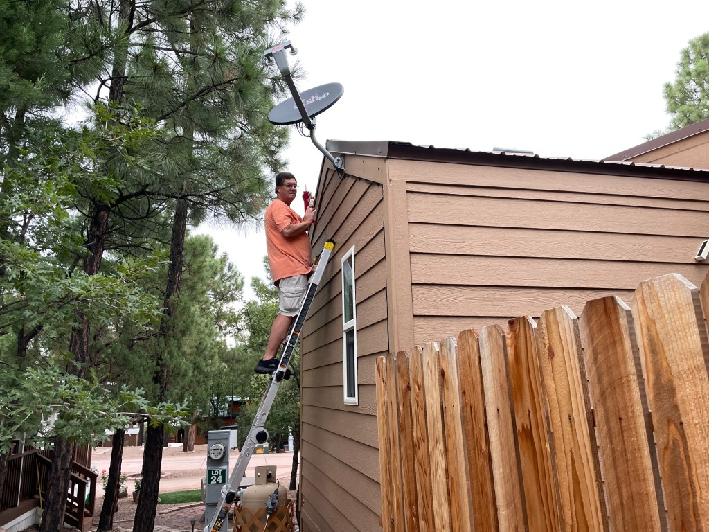 Randy took down the previous owner’s satellite dishes and put up our DISH dish from the RV. He set the dish and configured all the wires inside so it is a five minute task to hook up our home receiver and wireless Joey for the TVs in the cabin.