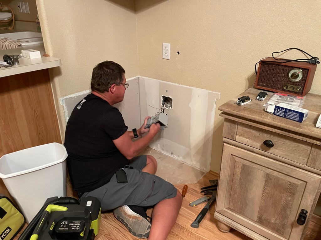 That meant removing the bottom cupboard, moving some wiring, repairing-texturing-and-painting the walls and those weren’t the bad parts of the project.