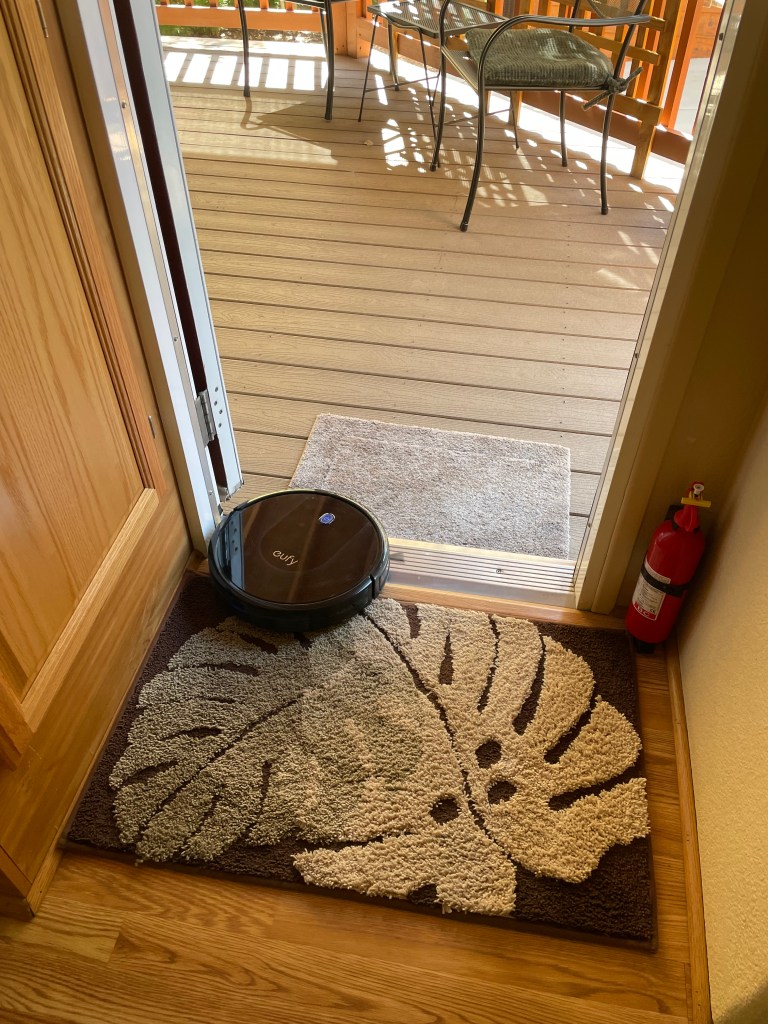 Our little vacuum robot, Eufy, thought she wanted to escape to the deck as well.