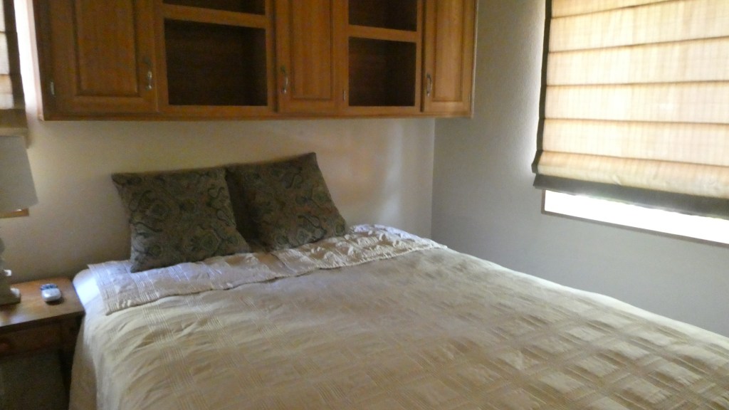 The second thing I thought I wanted was to remove these upper cabinets in the bedroom. This picture is how we first saw the bedroom and it seemed small and dark with that big cupboard above the bed.