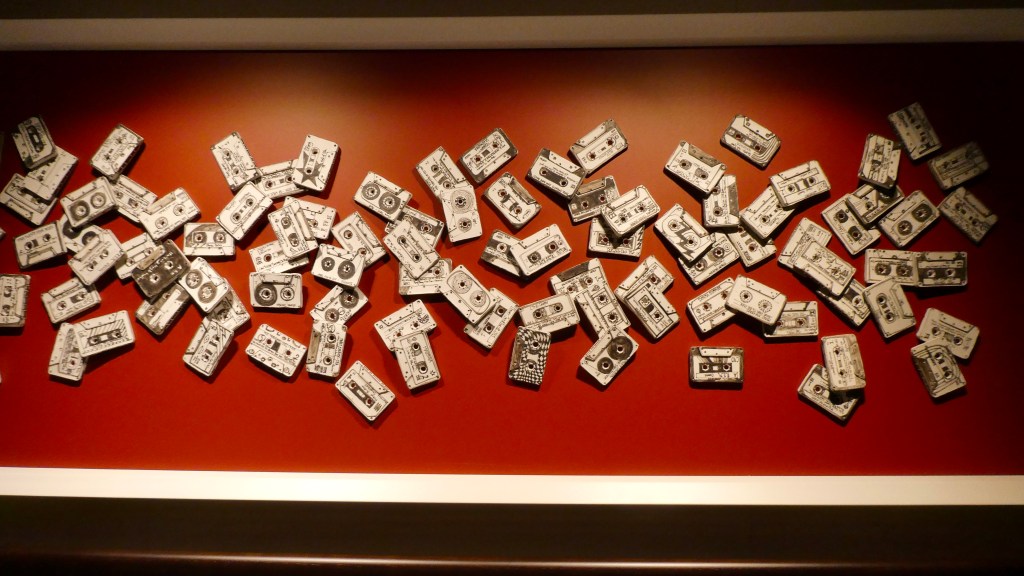 Interesting artwork. Old cassette tapes glued together seem like a waste of wall space but I did like the bead people.