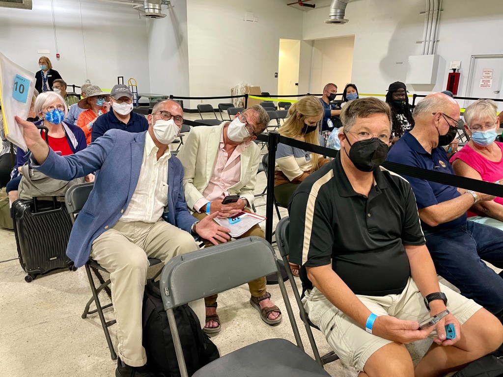 Usually embarkation goes very well for cruise lines but nothing is predictable in a Covid world.  The lines were very long for several ships – ours included.  We never learned exactly why but an additional Covid test certainly was a contributing factor!