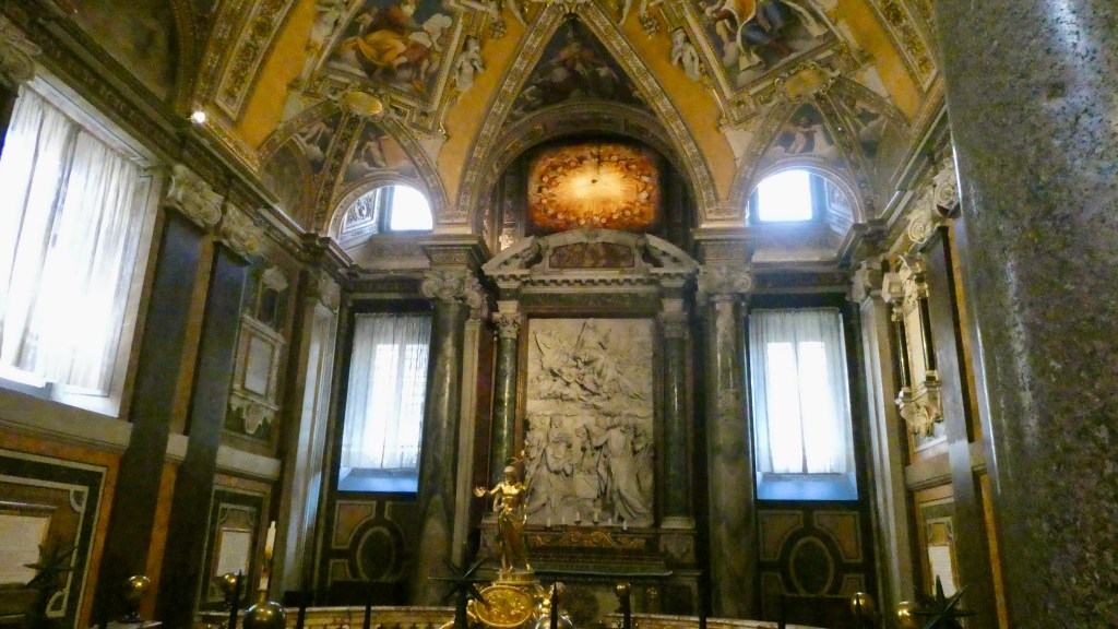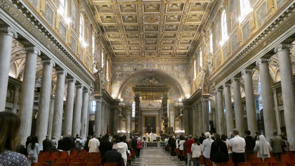 Our first stop was Santa Maria Maggiore Church, the third most important church in Roma. Although it is not within the boundaries of the Vatican, it is owned by the Vatican. It was built between the years 422 and 432, and consecrated in 434. There have been a number of modifications and renovations over the centuries. The14th century bell tower is the highest in Rome at 246 feet.