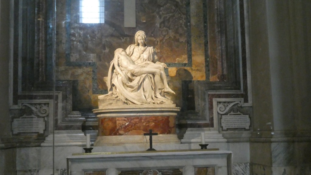 Michelangelo’s Pieta is behind a protective shield. It was vandalized in 1972. Michelangelo sculpted three Pietas. The others are in Florence and Milan.