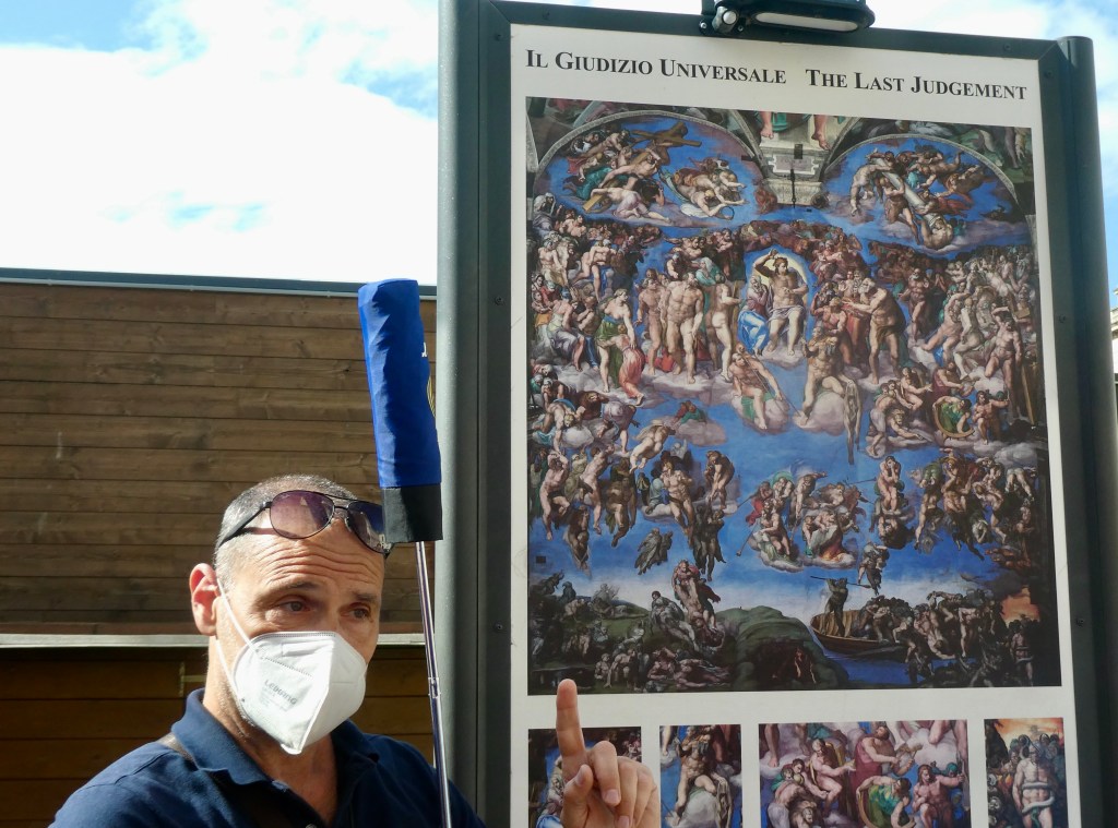 Because silence is required within the chapel, there are placards outside where guides explain what visitors will see. Our tour guide, or local specialist as Trafalgar calls them, was in the family business as both his mother and sister are also guides within the Vatican. He introduced them both as we ebbed and flowed with other groups on the grounds. Each guide has their own flag, umbrella or sign for visitors to follow.