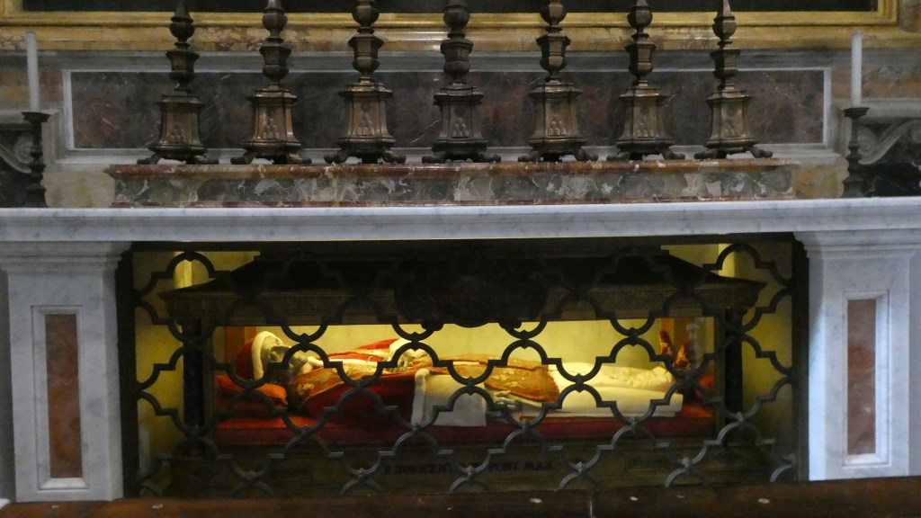 This pope or saint lies in a glass coffin upstairs in the basilica proper. My notes and research failed me for knowing who he was.