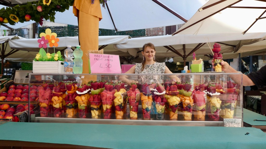 When we saw the fruit vendor we stopped and immediately bought fresh fruit cups – selecting those with our favorite fruits.  We had been enjoying good food in Italy but were offered very few fresh vegetables (usually only eggplant) and almost no fresh fruit.  (I know tomatoes are technically a fruit, and they were everywhere, but they are not fruit salad fruit.)