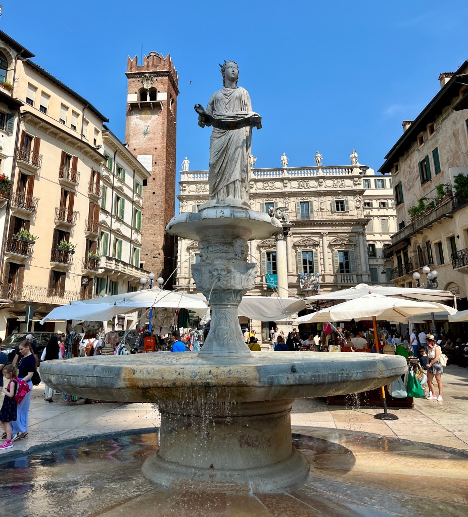 We walked down the road, and above the Roman city, to the Piazza delle Erbe. We saw the fountain and browsed the vendor tents.
