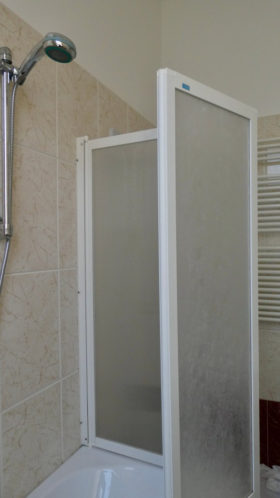 This is just one of the many, sometimes laughable, shower configurations we experienced.  Obviously there was an attempt at a shower screen but the bathroom ended up soaking wet!  There was a floor drain so they were prepared.
