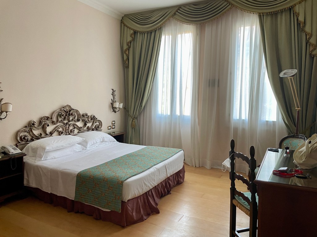 This is the hotel room we woke up in on the day we were leaving for Verona.  It is fairly typical of what our rooms in older hotels looked like.  They were generally good size with old style furniture.  This one had power and USB outlets on just one side of the bed – which was pretty typical when they were even available.  We had taken along some 10 foot USB cords and were glad we had them.