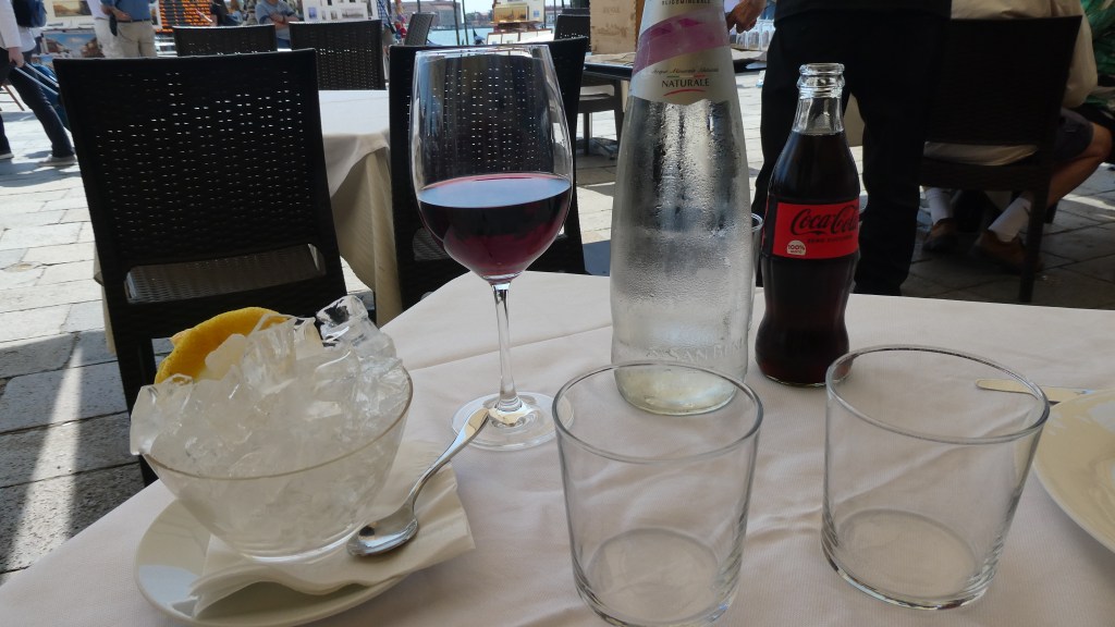 Some eating and drinking comparisons… There are three types of water available in Italy and they are in glass bottles.  There is sparkling, mineral and still water and you pay for whichever you choose in a restaurant.  After a few mishaps we definitely learned to ask for still water.  I don’t like carbonation and neither of us liked the mineral water.  It was usually easier just to drink wine!