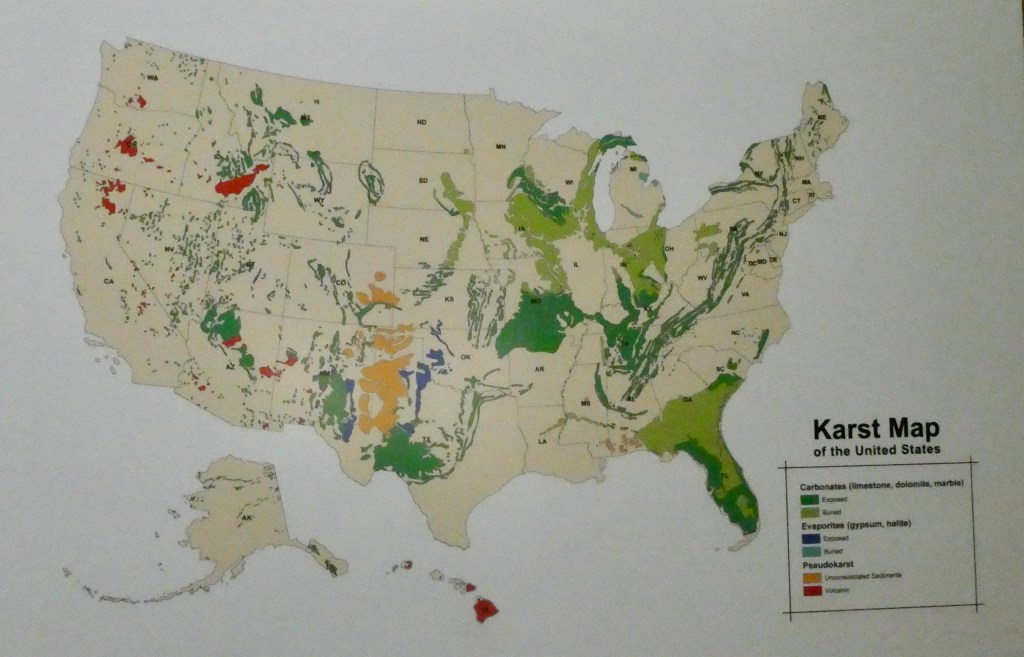 This kind of limestone topography is called Karst. The map shows Karst areas in green.
