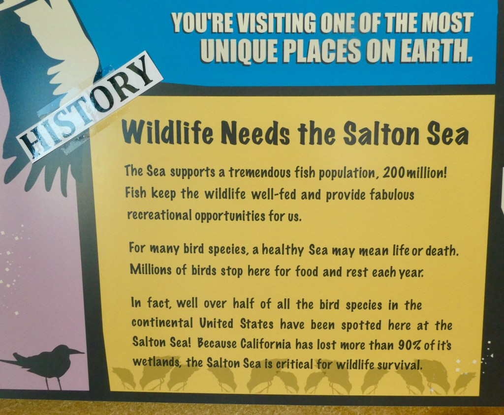 With climate change and drought, the salinity has increased too much to support fish and the last of the fish died two years ago. Given that, there are now much fewer birds. The politician Sonny Bono was very interested in the health of the Salton Sea. There are maintained birding areas with his name in the southern part of the sea.